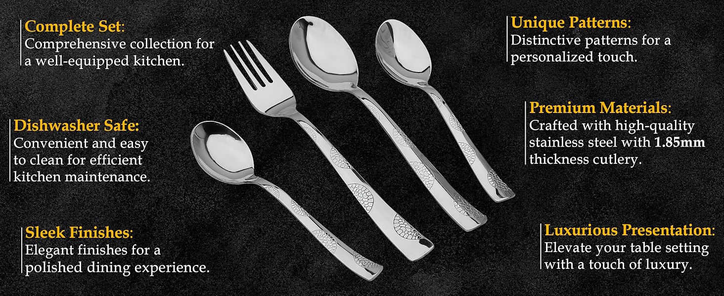 This 18-piece stainless steel cutlery set offers a complete dining experience with spoons and forks elegantly presented in a gift box. Crafted from durable stainless steel, each piece combines functionality with a sleek, polished finish that resists rust and corrosion. Ideal for both everyday use and special occasions, this set enhances your table setting while ensuring long-lasting performance and easy maintenance.