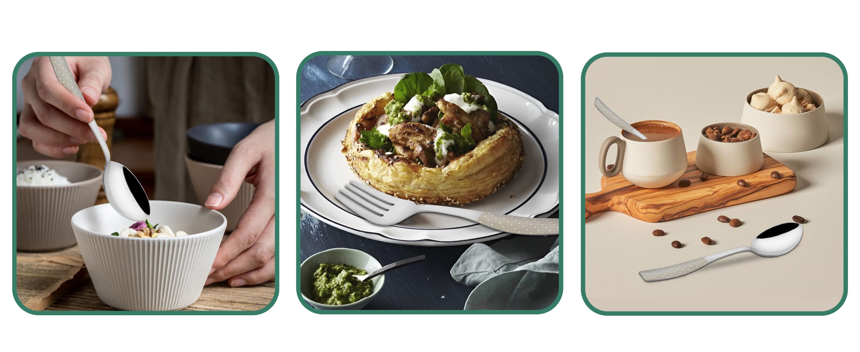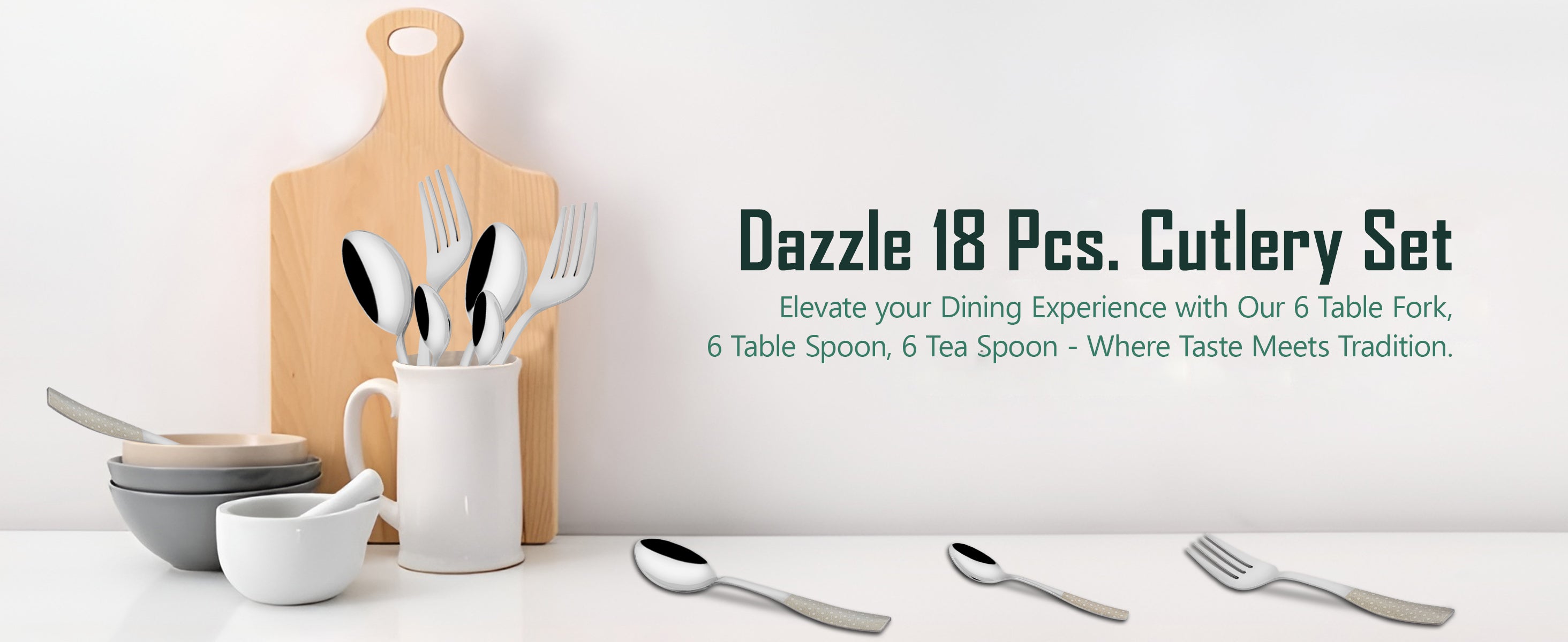 This 18-piece cutlery set features premium stainless steel spoons and forks finished in a sleek Silver Dazzle design. Crafted for durability and elegance, each piece withstands daily use while maintaining its polished look. Ideal for enhancing both everyday meals and special occasions, this set offers reliable performance and a sophisticated touch to your dining experience.