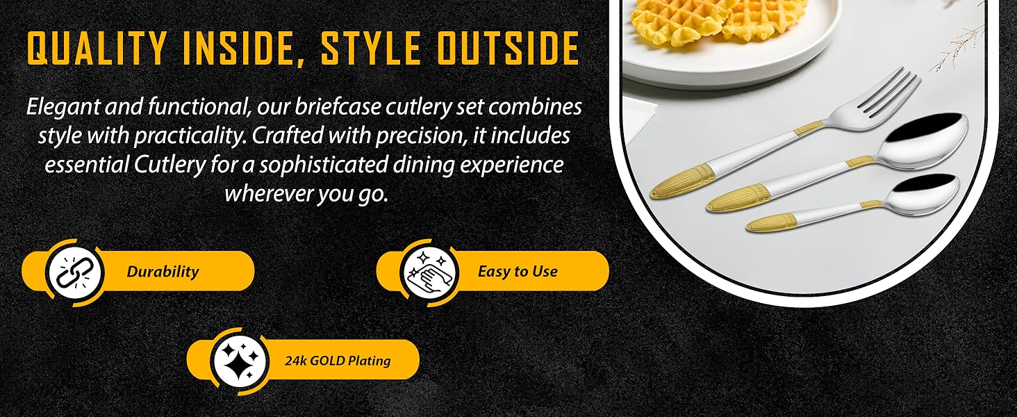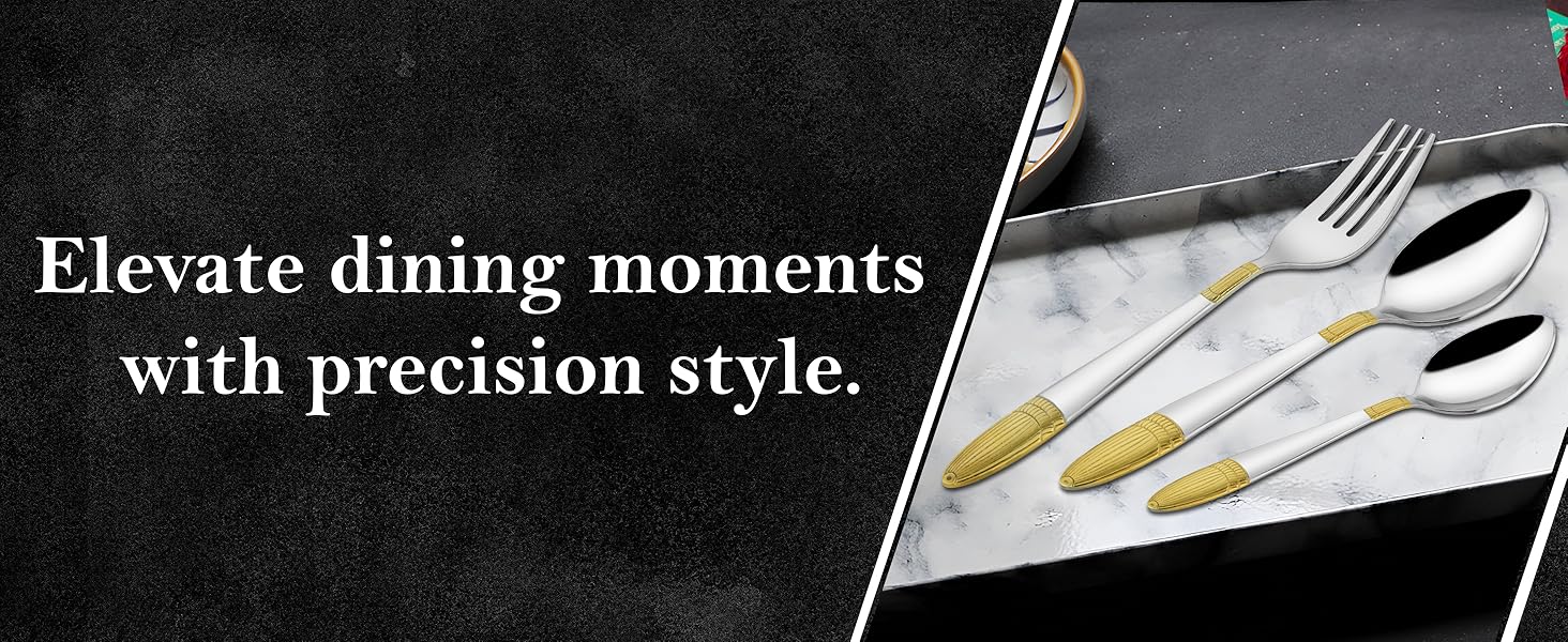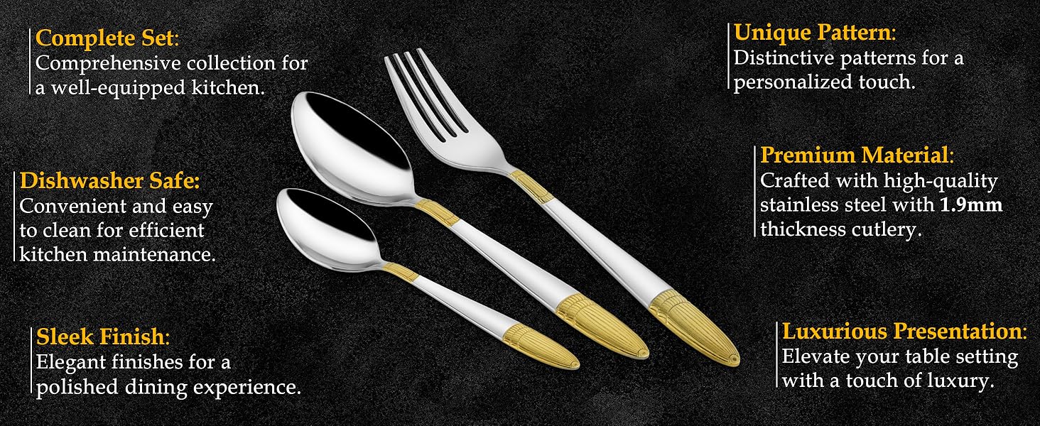 Elevate your dining experience with this 18-piece stainless steel golden cutlery set, elegantly presented in an ivory-designed gift box. Crafted from durable stainless steel with a luxurious golden finish, each piece combines style with lasting functionality. Perfect for formal occasions or as a refined gift, this set enhances table settings while ensuring ease of use and maintenance. Its balanced design offers comfort and precision for every meal.