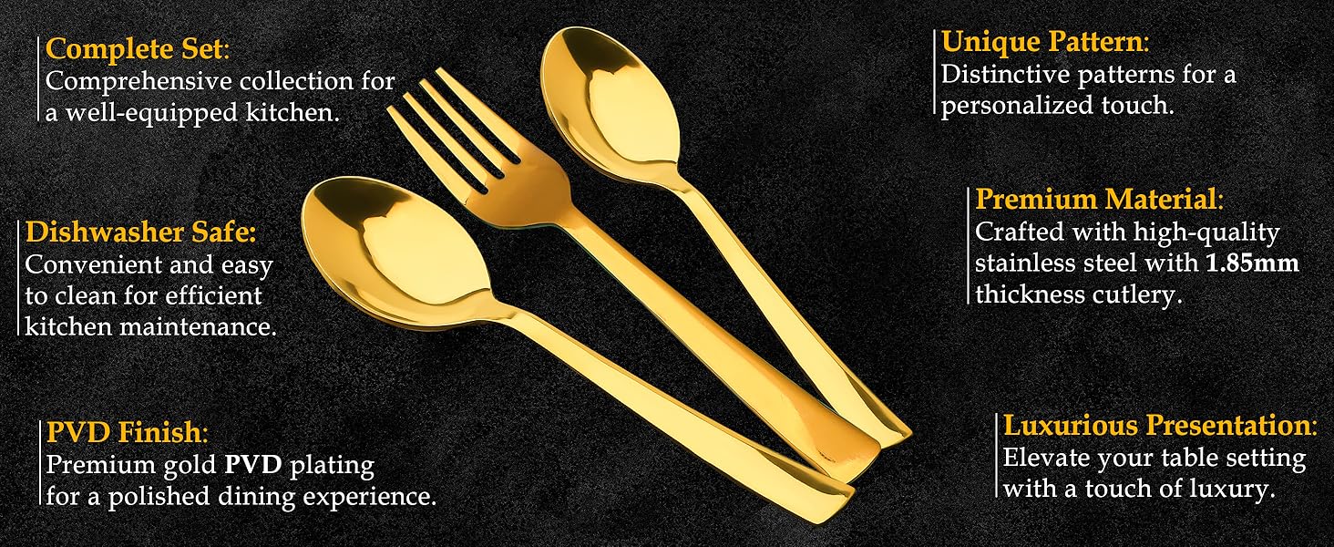 This 18-piece cutlery set features stainless steel utensils coated with durable PVD gold for a luxurious finish that resists tarnish and wear. Packaged in an elegant gift box, it offers a complete dining solution with forks, knives, spoons, and teaspoons. Designed for both everyday use and special occasions, this set combines style with lasting performance, making it an excellent choice for refined table settings and thoughtful gifting.