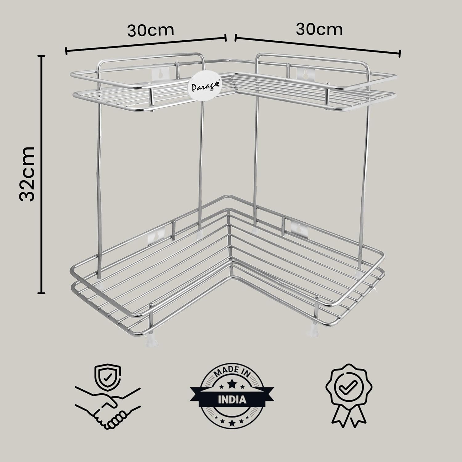 2 Tier Stainless Steel Corner Rack | L Shape Wall Mount Kitchen Shelf