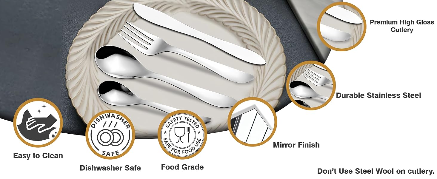 - QUALITY MATERIAL: This silverware set is made from quality Stainless Steel, durable enough for everyday use, the mirrored finish strengthens its resistance to rust, tarnishing, and corrosion. Ensuring years of durability.