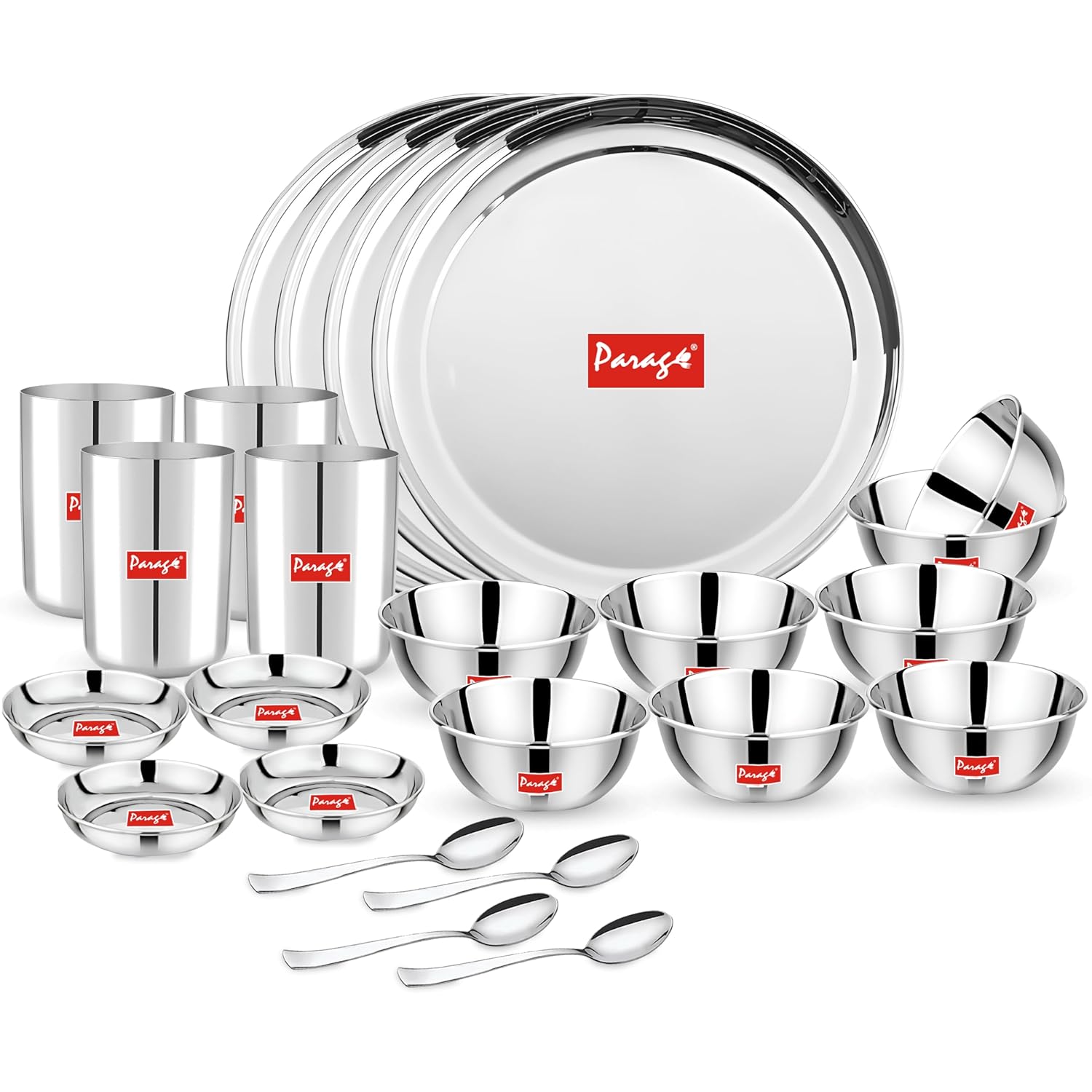 This 24-piece stainless steel dinner set includes plates, bowls, and glasses, all crafted in durable silver-finish stainless steel. Designed for both everyday use and special occasions, it offers a complete tableware solution that balances style with practicality. The stainless steel construction ensures long-lasting resistance to rust and corrosion, making it easy to clean and maintain. Ideal for households seeking a sleek, sturdy, and hygienic dining experience with timeless appeal.