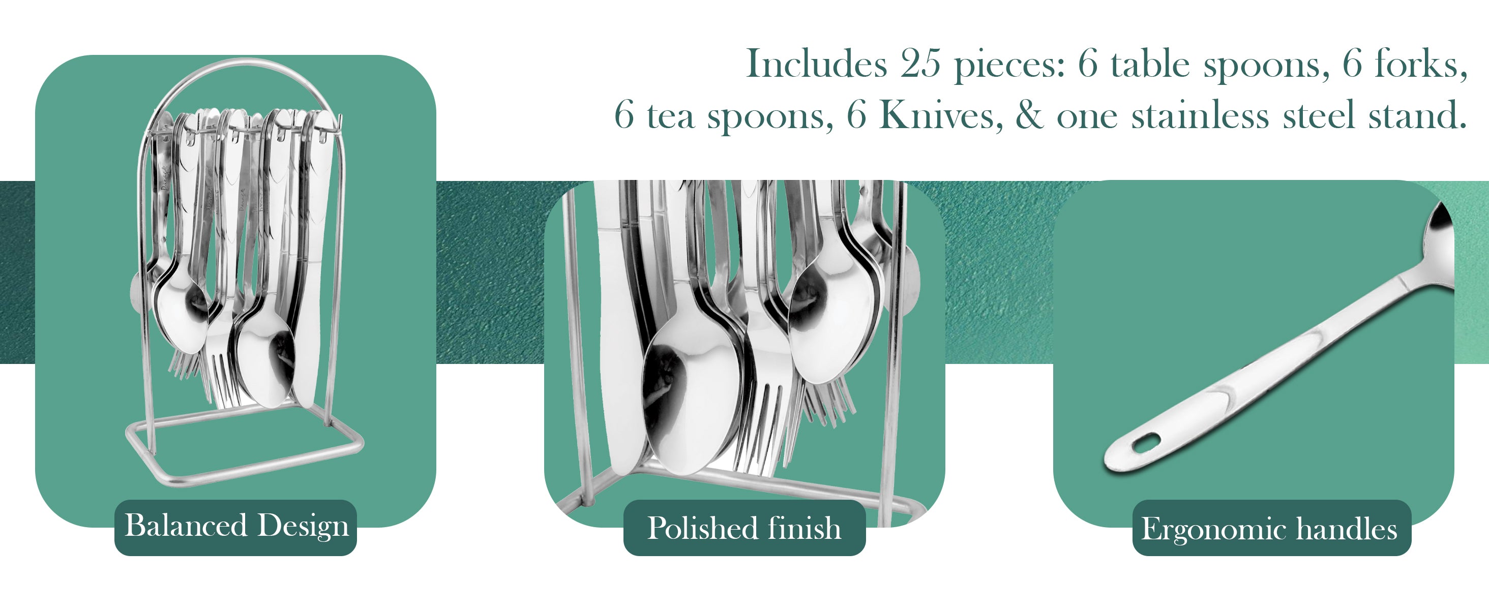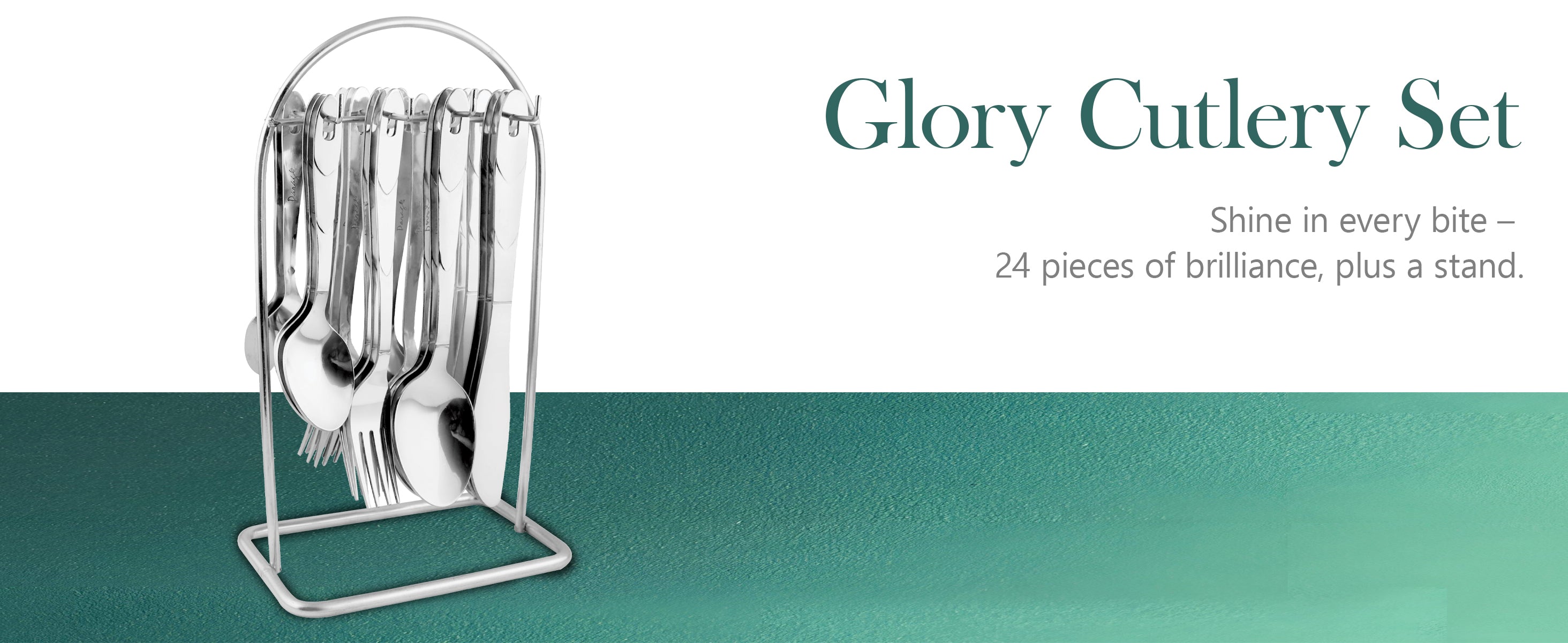 - COMPREHENSIVE 24-PIECE SET-: The Glory Stainless Steel Cutlery Set includes a total of 24 pieces, ensuring you have all the essential utensils for a complete dining experience. The set comprises 6 table spoons, 6 forks, 6 tea spoons, 6 knives, and a convenient stand for organized storage.