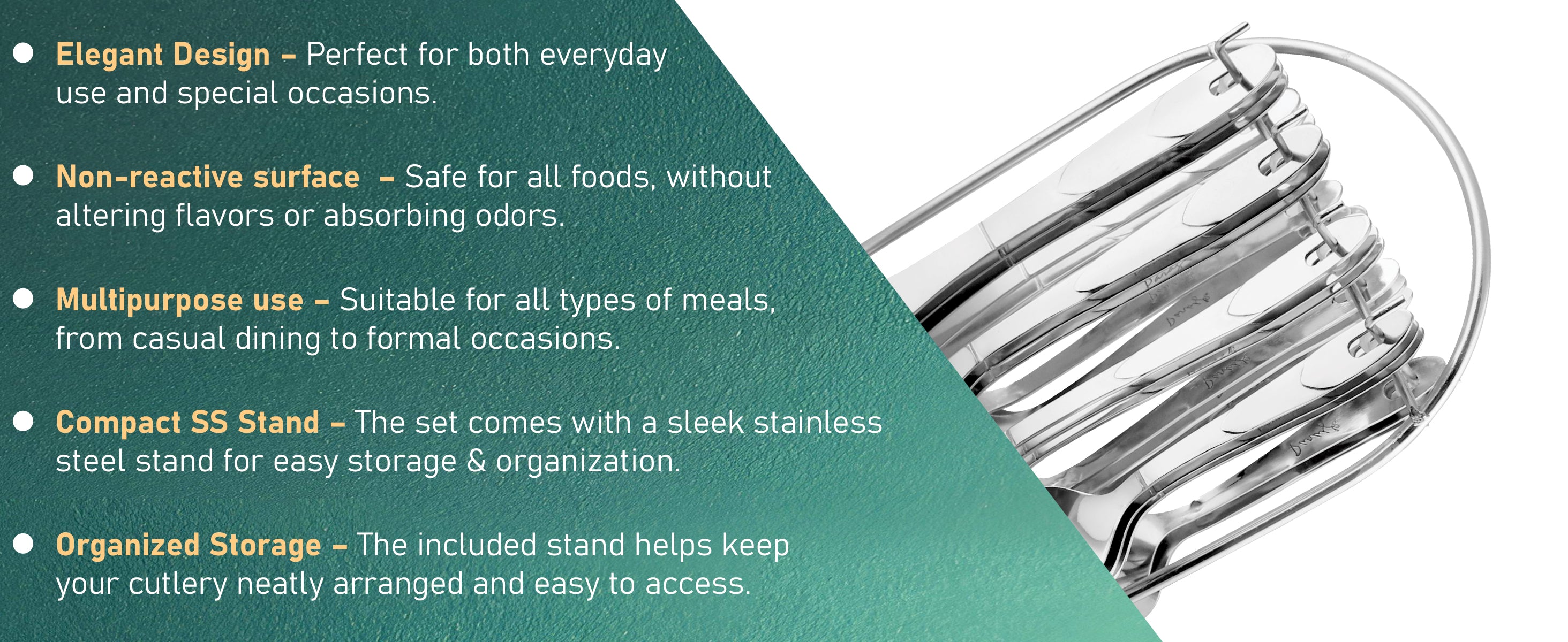 - PREMIUM STAINLESS STEEL CONSTRUCTION-: Crafted from high-quality stainless steel, this cutlery set guarantees durability, resistance to corrosion, and a polished appearance. The robust material ensures longevity, making it suitable for daily use in your kitchen.