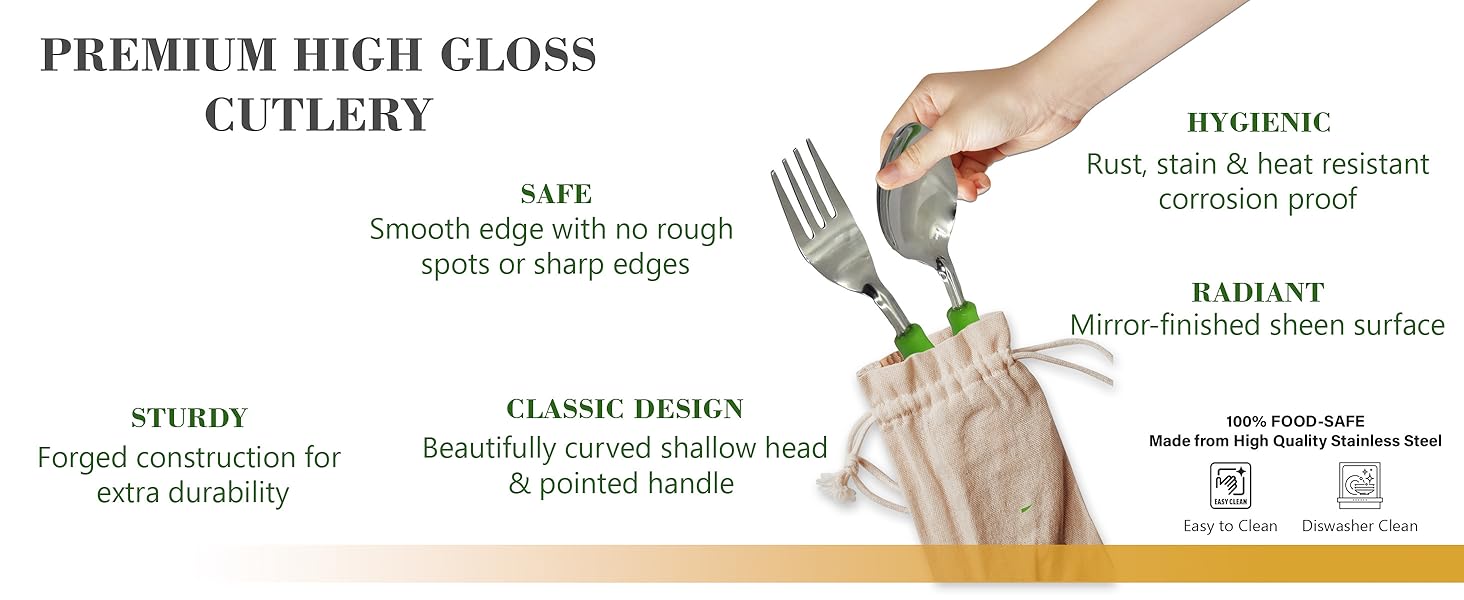 - DURABILITY: Stainless steel cutlery sets are renowned for their exceptional durability, ensuring a long-lasting investment in quality kitchenware. Smooth edges for safety. It does not break, crack, stick or melt even after years of heavy use.