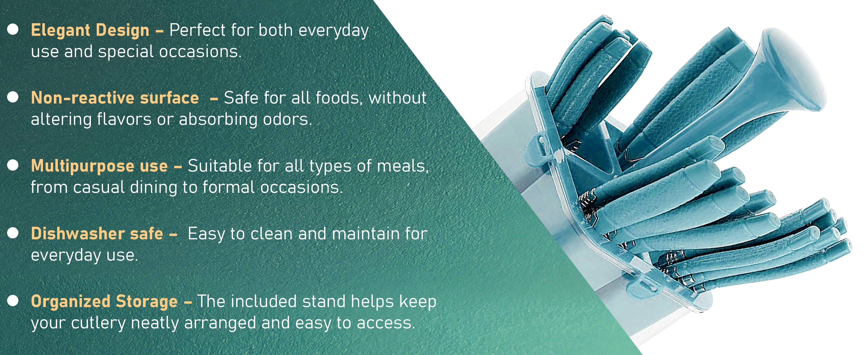 - BEAUTIFULLY DESIGNED: It is not react to food. Elegant and innovative design. Long term valuable product; Spoon set with stand for dining table; Cutlery set with knife; spoon fork knife set;