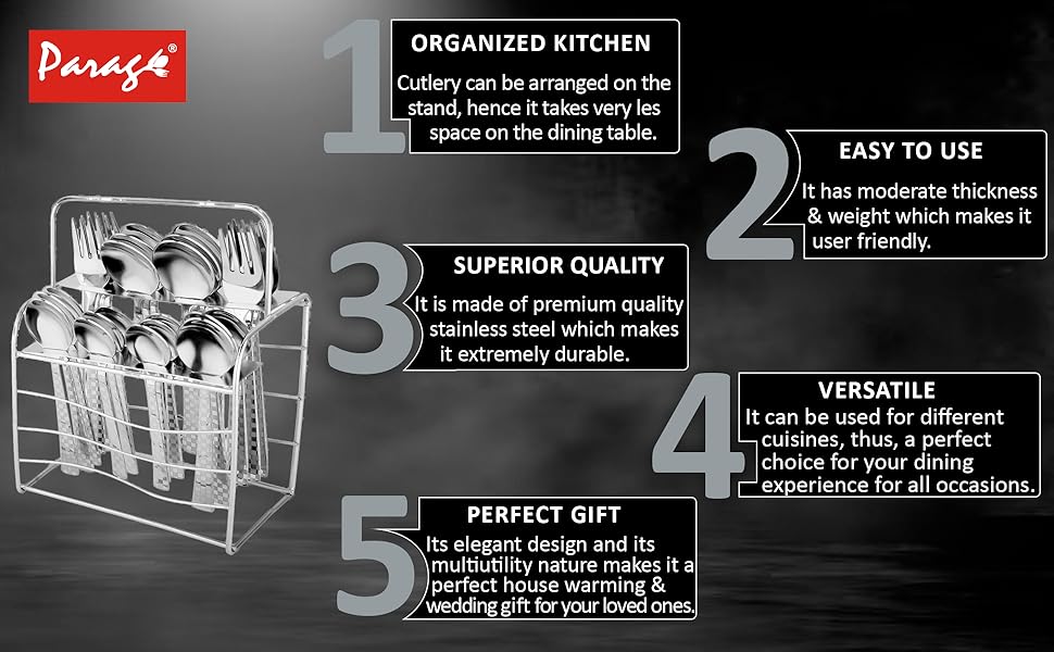 - β€CONTENTS: 1.6 mm thick 6- pieces each of Table spoons, Forks, Tea spoons and Dinner spoons, spoon stand