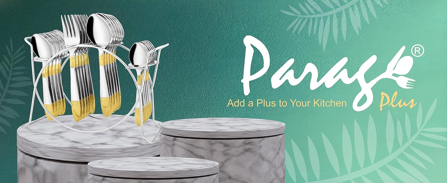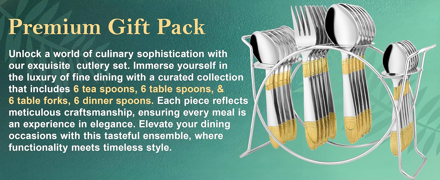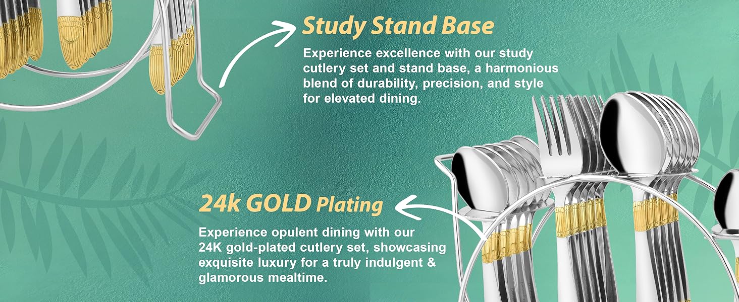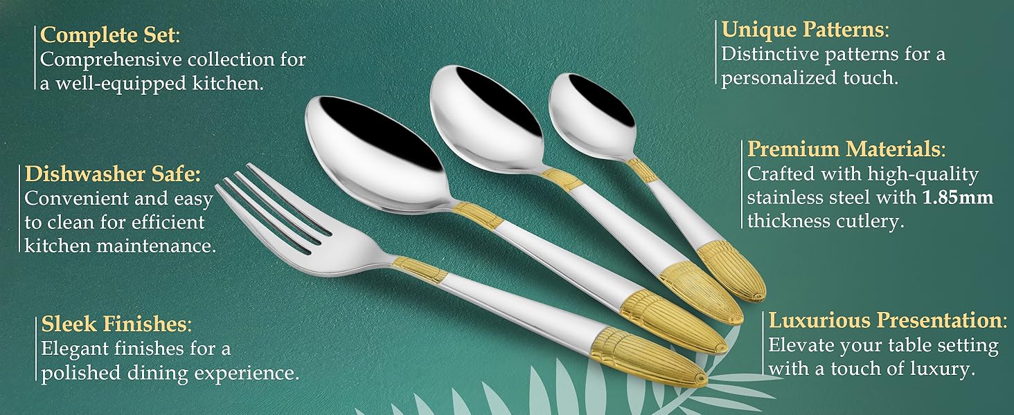 - PREMIUM STAINLESS STEEL WITH 24k GOLD FINISH: Crafted from high-quality stainless steel, these spoons & forks are plated with genuine 24k gold, ensuring durability, corrosion resistance, and a stunning golden finish. It gives dual tone feel because of the combination of 24k Karat gold and matt finish used on the cutlery handle.