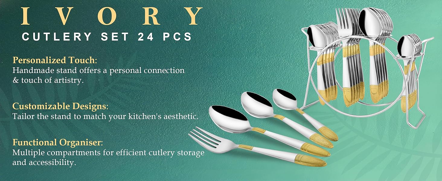 25-Piece Ivory Gold Stainless Steel Cutlery Set with Stand | 24K Gold Plated Spoons & Forks