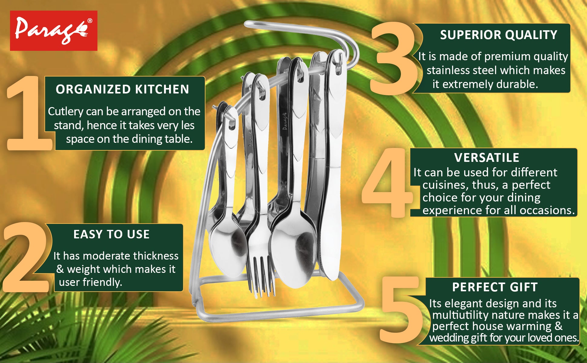 25 Pieces Creta Stainless Steel Cutlery Set for Home & Kitchen – Includes 6 Table Spoons, 6 Forks, 6 Tea Spoons, 6 Knives, 1 Stand, Stylish Spoon Set for Dining Table, Silver