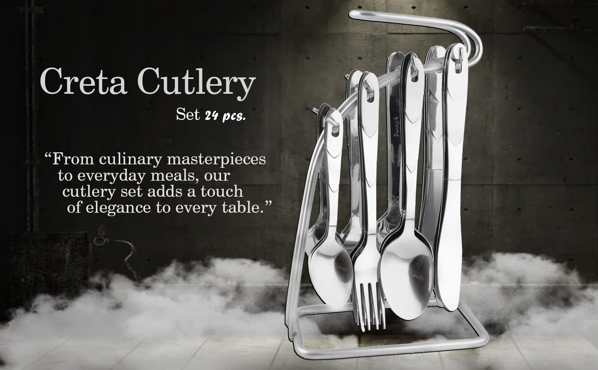 Elevate your dining experience with the 25 Pieces Creta Stainless Steel Cutlery Set. Crafted for durability and elegance, this set includes 6 table spoons, 6 forks, 6 tea spoons, and 6 knives, all housed in a sleek stand for organized storage. Ideal for everyday use or special occasions, the polished silver finish adds a refined touch to any table setting, while the robust stainless steel ensures long-lasting performance and easy maintenance. Perfectly balanced for comfort and functionality, this set enhances both your home and kitchen with style and practicality.