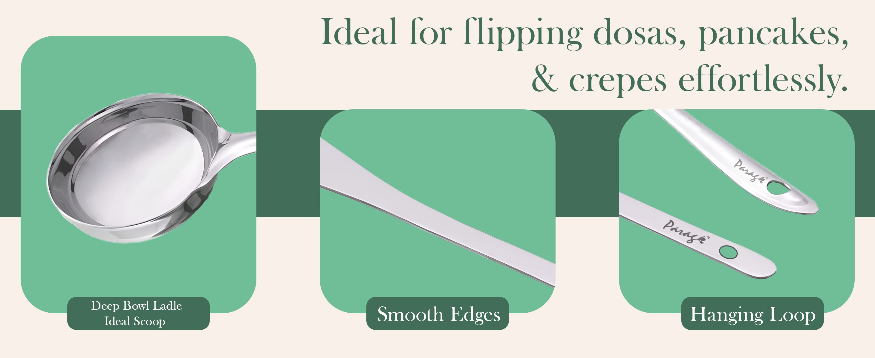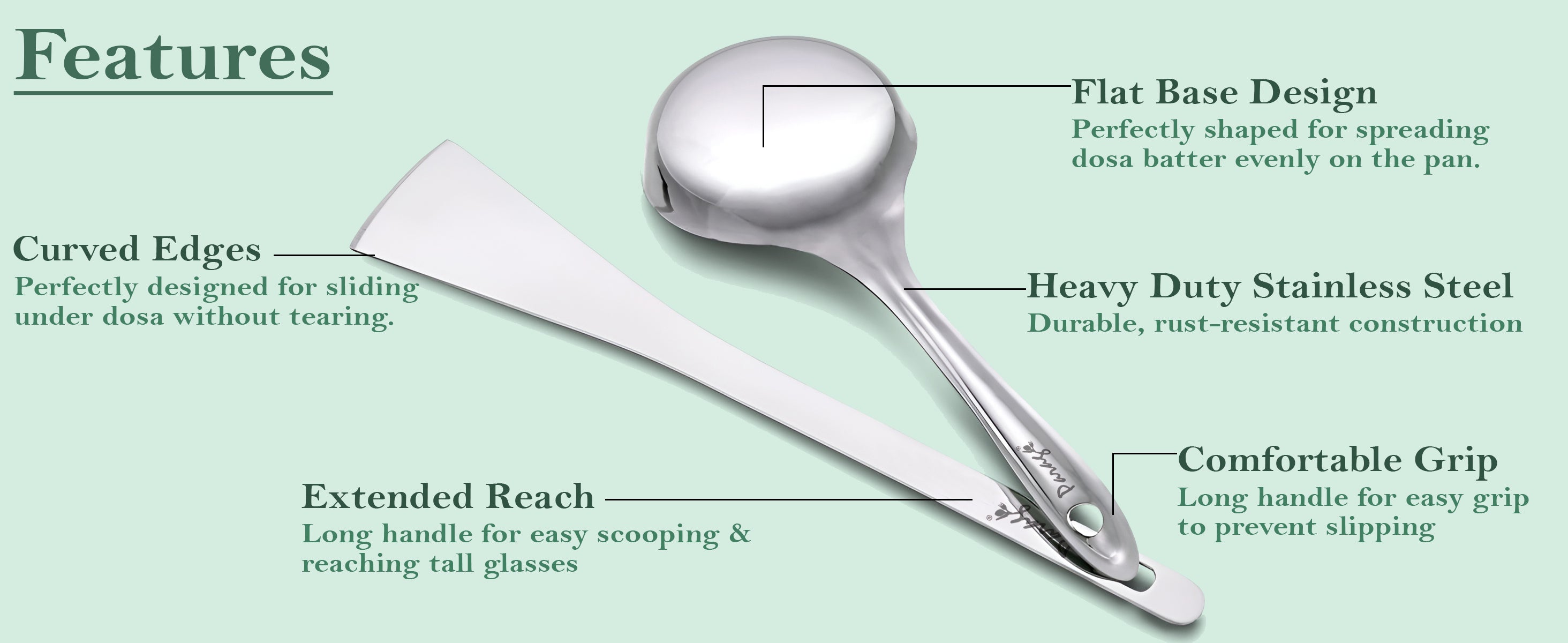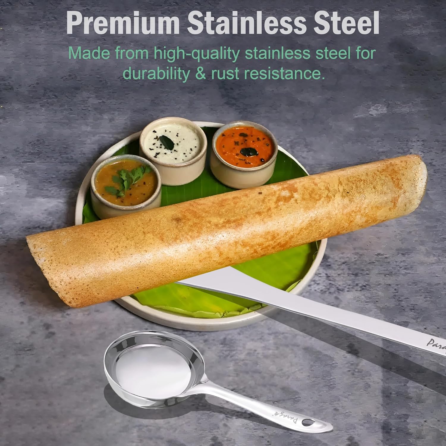 2 Pieces Stainless Steel Dosa Ladle & Turner, 20.5 cm & 31.5 cm – Heavy Gauge Kitchen Tools with Flat Base Spatula for Cooking, Silver Finish