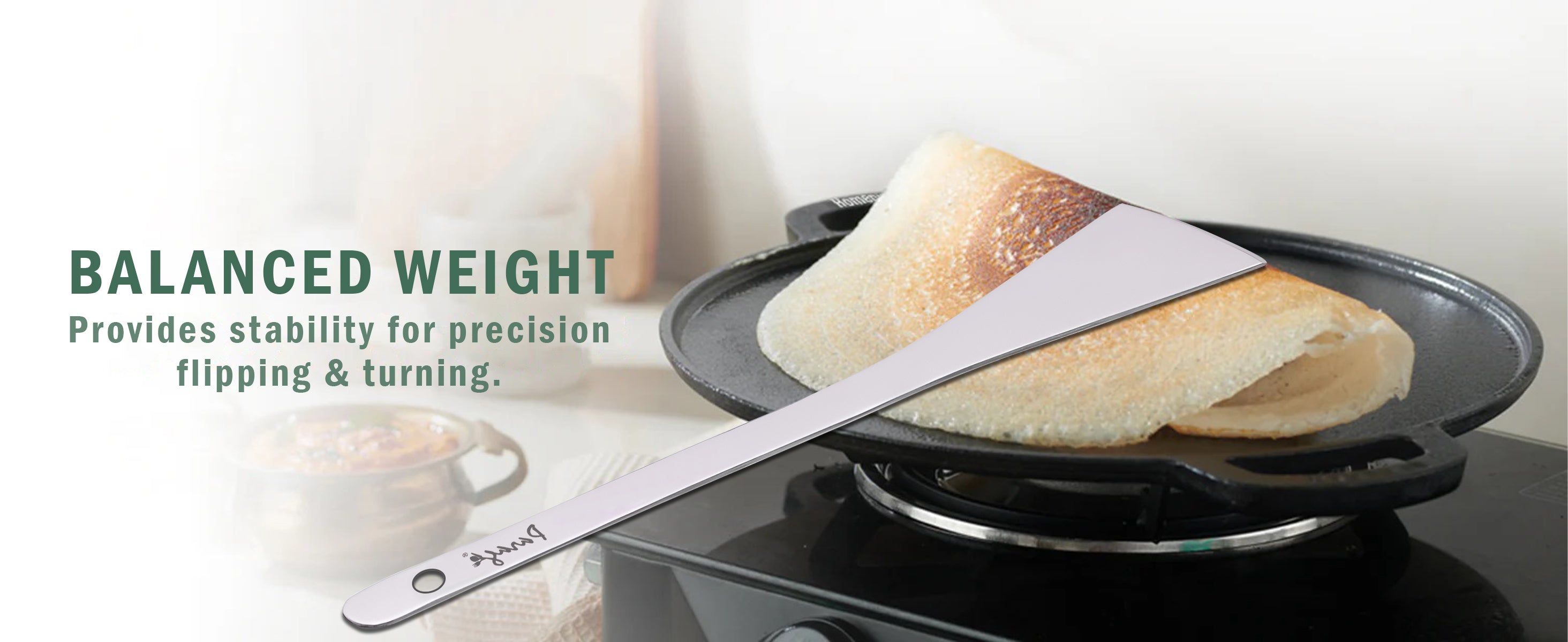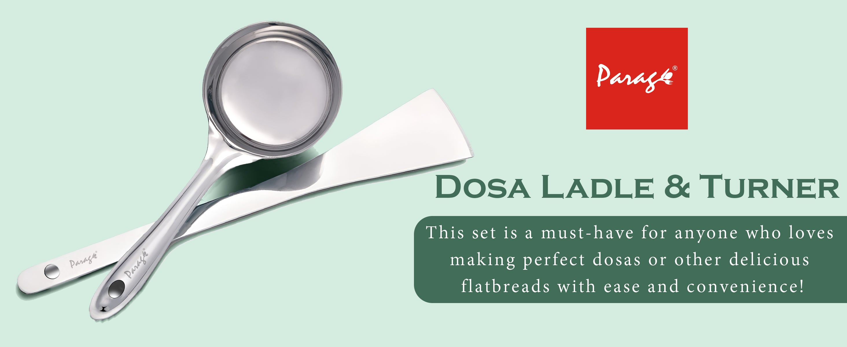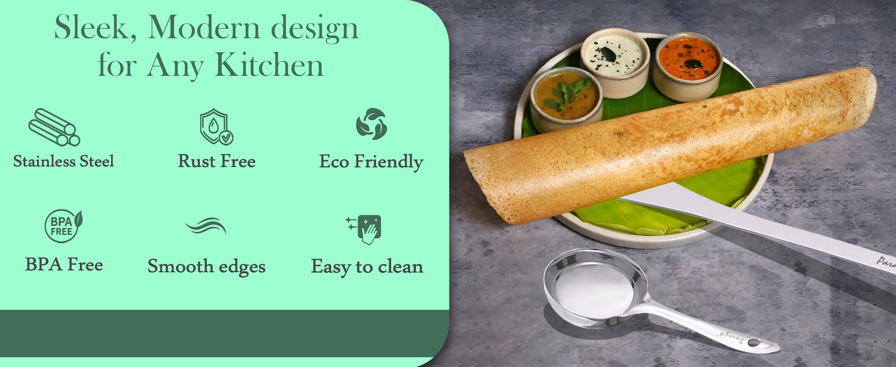 2 Pieces Stainless Steel Dosa Ladle & Turner, 20.5 cm & 31.5 cm – Heavy Gauge Kitchen Tools with Flat Base Spatula for Cooking, Silver Finish