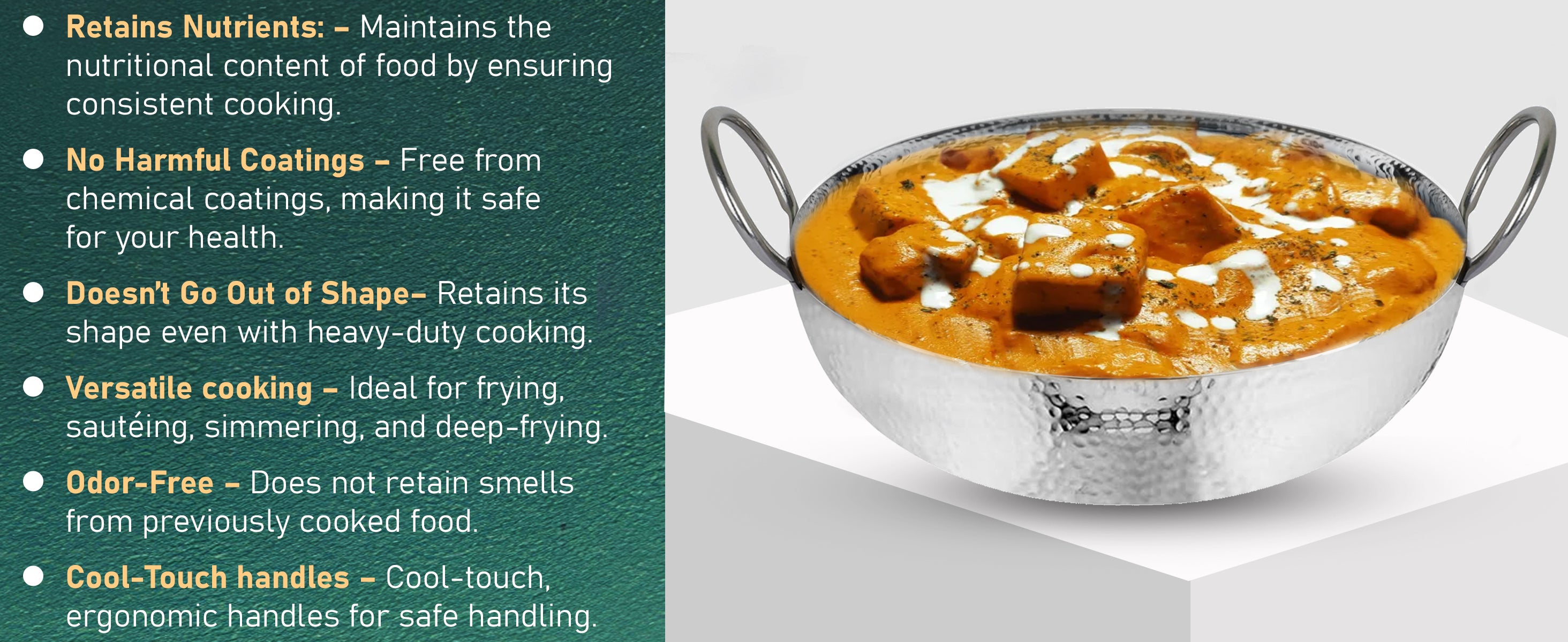 This 2-piece hammered stainless steel kadhai set features heavy-bottom construction, ensuring even heat distribution perfect for cooking and deep frying. Designed for gas stove compatibility, it includes two sizes—1.2 L and 2 L—to suit various culinary needs. Its durable stainless steel body offers long-lasting performance and easy maintenance, making it a reliable addition to any kitchen.