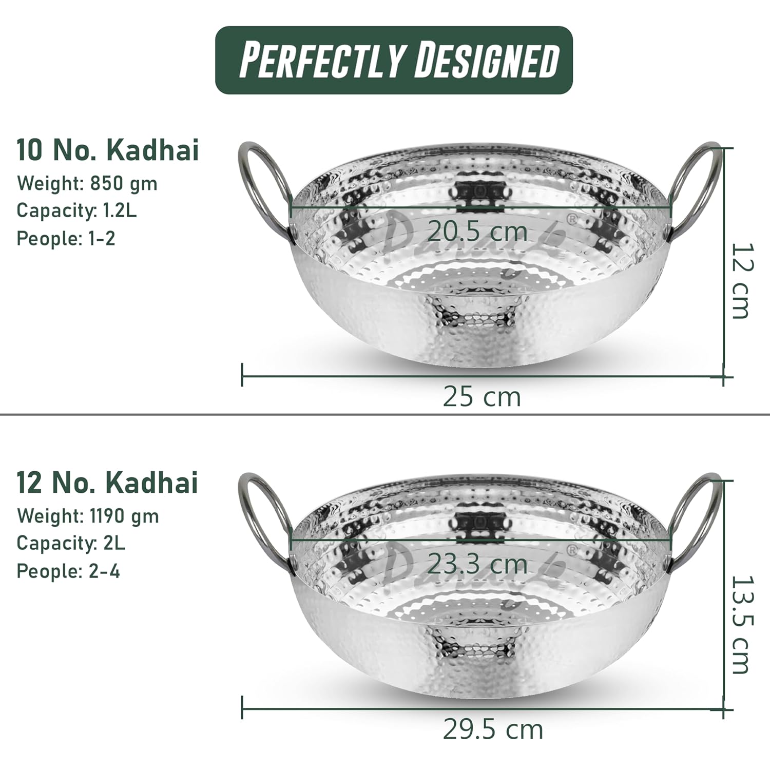 2 Pcs Stainless Steel Hammered Kadhai Set – Heavy Bottom for Cooking & Deep Frying, Gas Stove Friendly, Capacities 1.2 L & 2 L, Silver