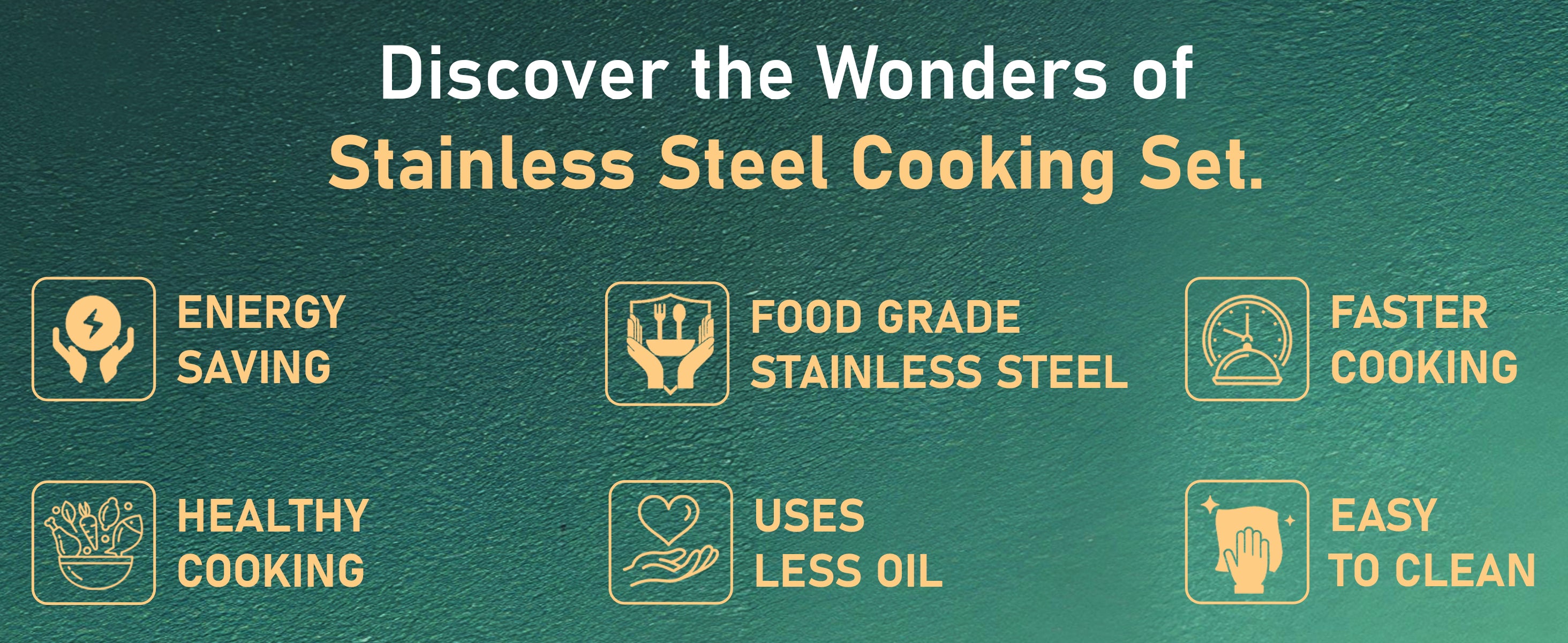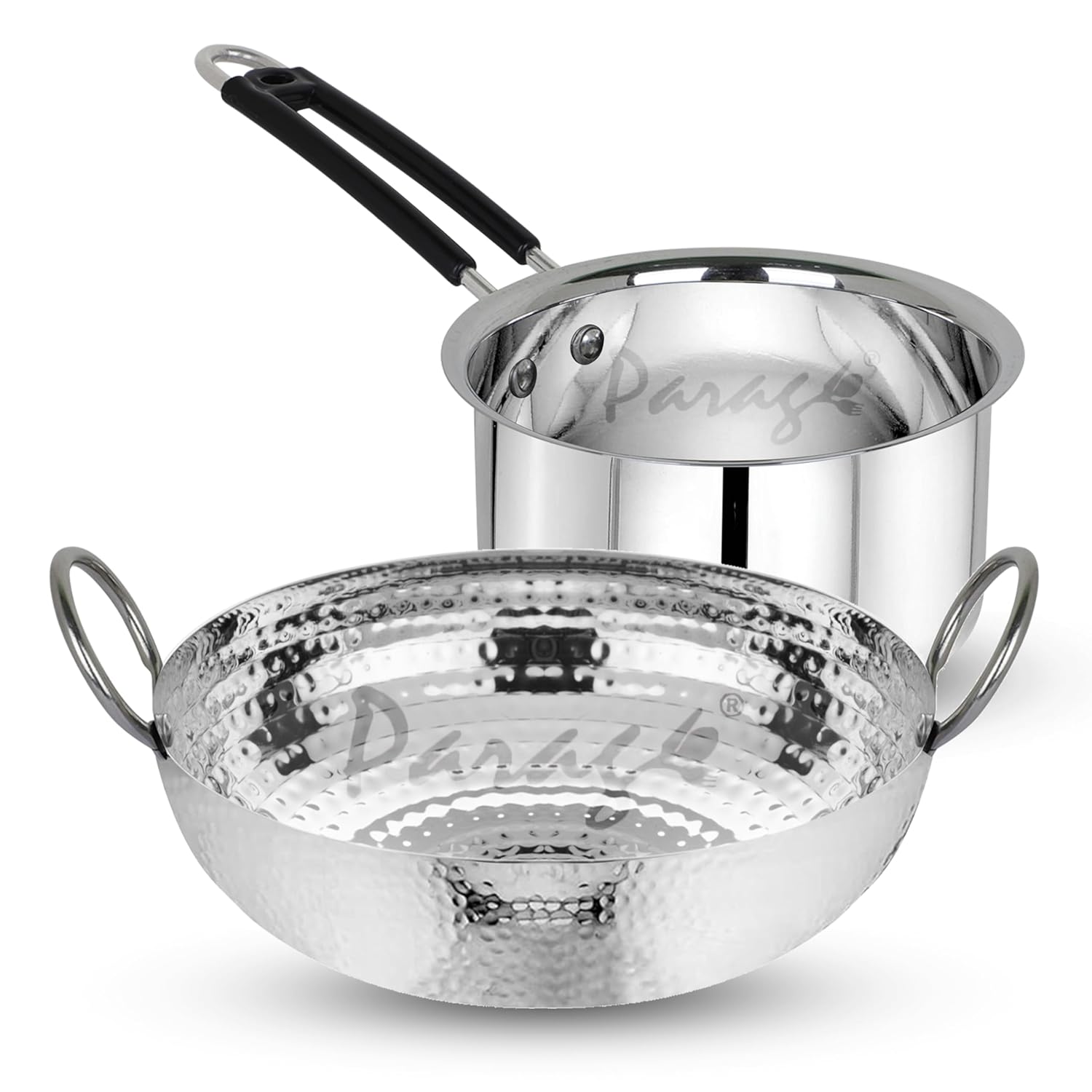 Elevate your kitchen with this expert 2-piece stainless steel hammered kadhai and saucepan set. Designed with heavy bottoms, these vessels ensure even heat distribution, making them perfect for cooking and deep frying on gas stoves. The kadhai holds 2 liters, ideal for larger recipes, while the 1.75-liter saucepan suits everyday cooking needs. Crafted in durable silver stainless steel, this set combines functionality with lasting performance.