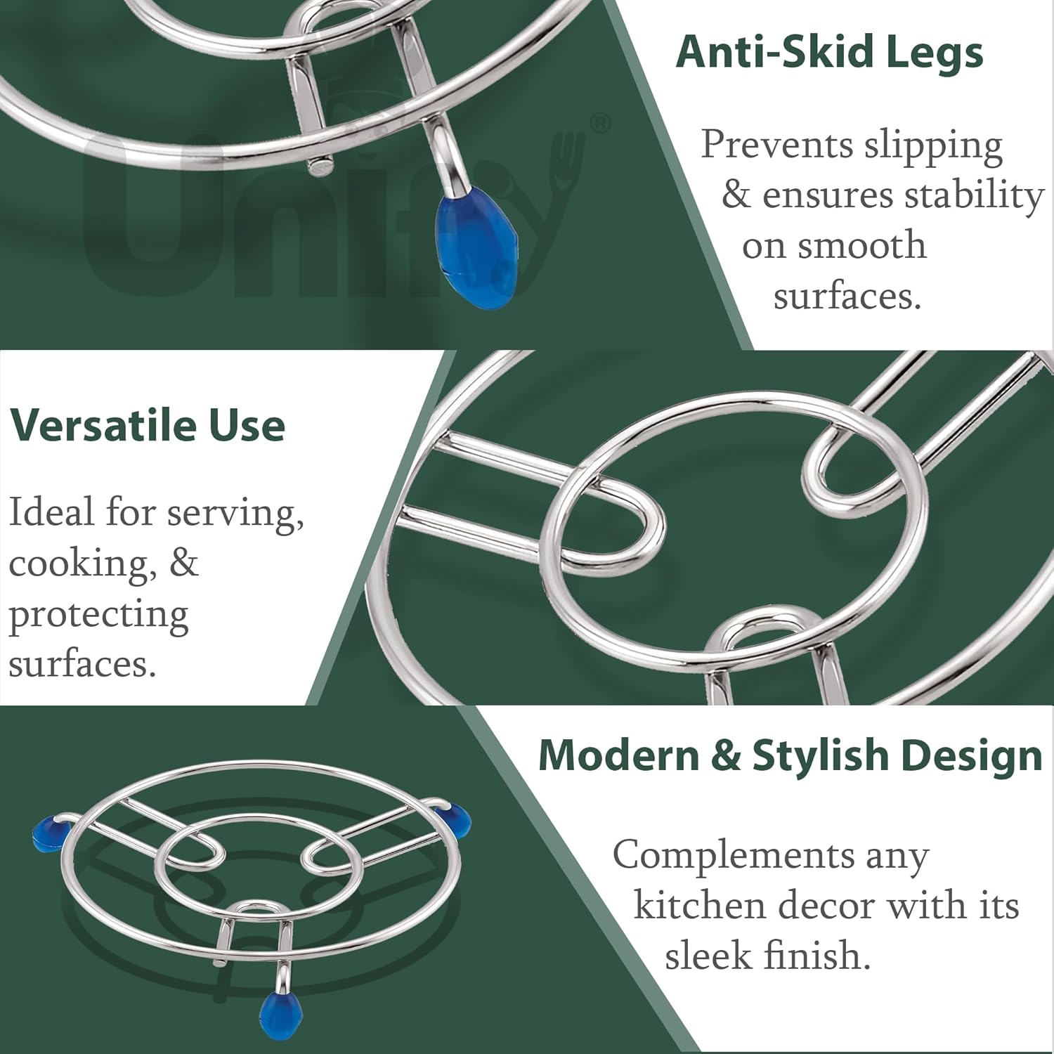 Protect your countertops and dining table with this 3-piece Stainless Steel Trivet Set. Designed for versatility, these trivets work as hot pot mats, pan stands, utensil holders, cooker rings, or cooling racks. Made from durable stainless steel, they are rust-resistant, heat-proof, and long-lasting. The round pad design ensures stability for pots, pans, and other cookware. Available in sizes 6, 7, and 8 inches, this set is perfect for everyday kitchen and dining use.