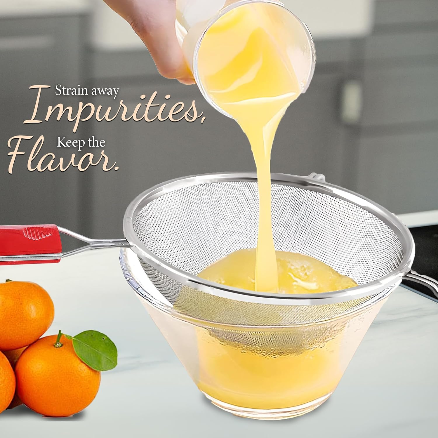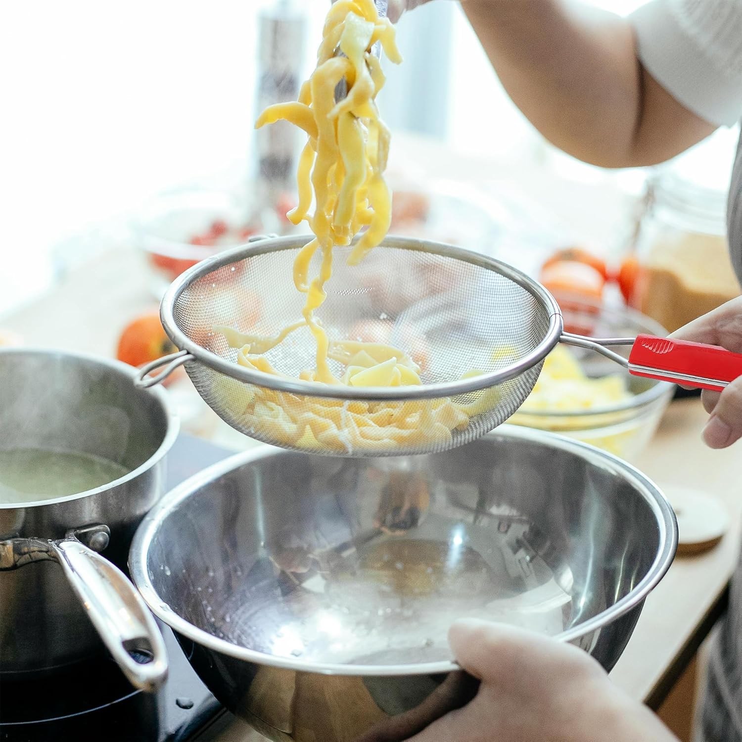 Stainless Steel Soup & Juice Strainer, 16 cm Kitchen Liquid Filter – Large Soup Chalni with Red Handle for Rice & Juice, Set of 1