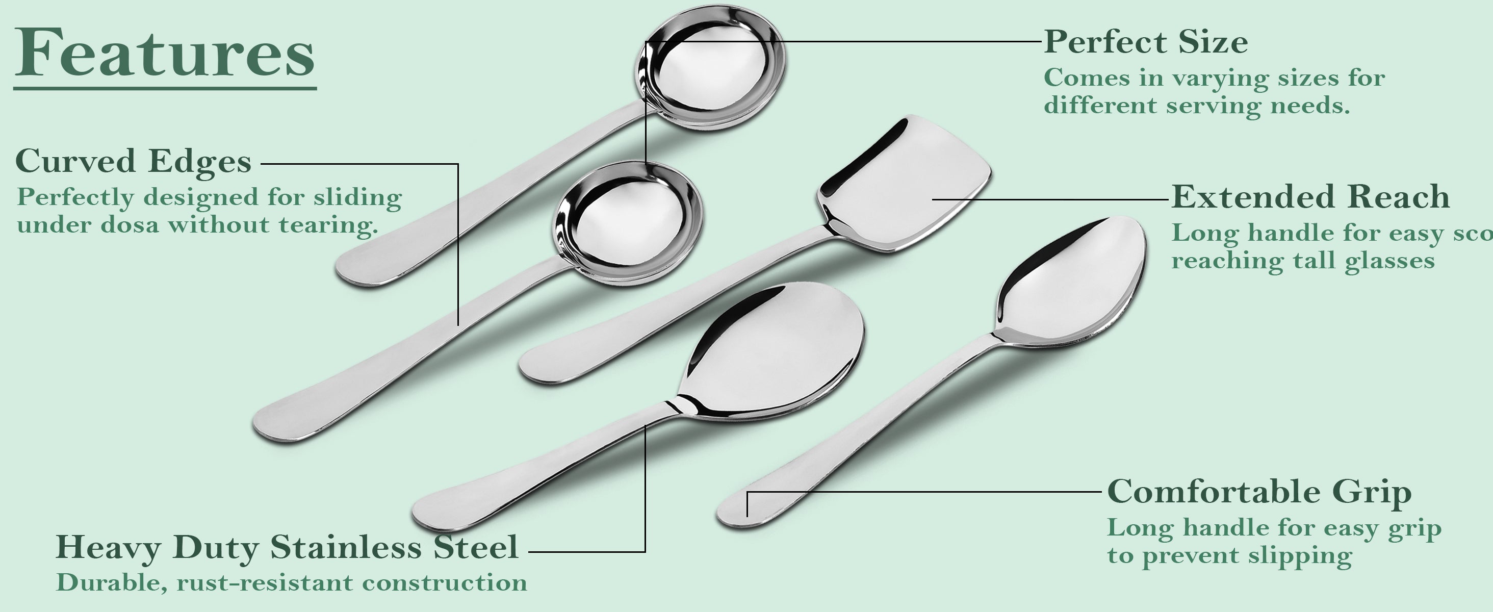- PACKAGE INCLUDE :- We are offering 5 steel kitchen accessories items- 2 Ladle (Karchi), 1 Turner/Spatula (Palta), 1 Rice Spoon, 1 Pan (Basting Spoon) for all your cooking and serving needs.
