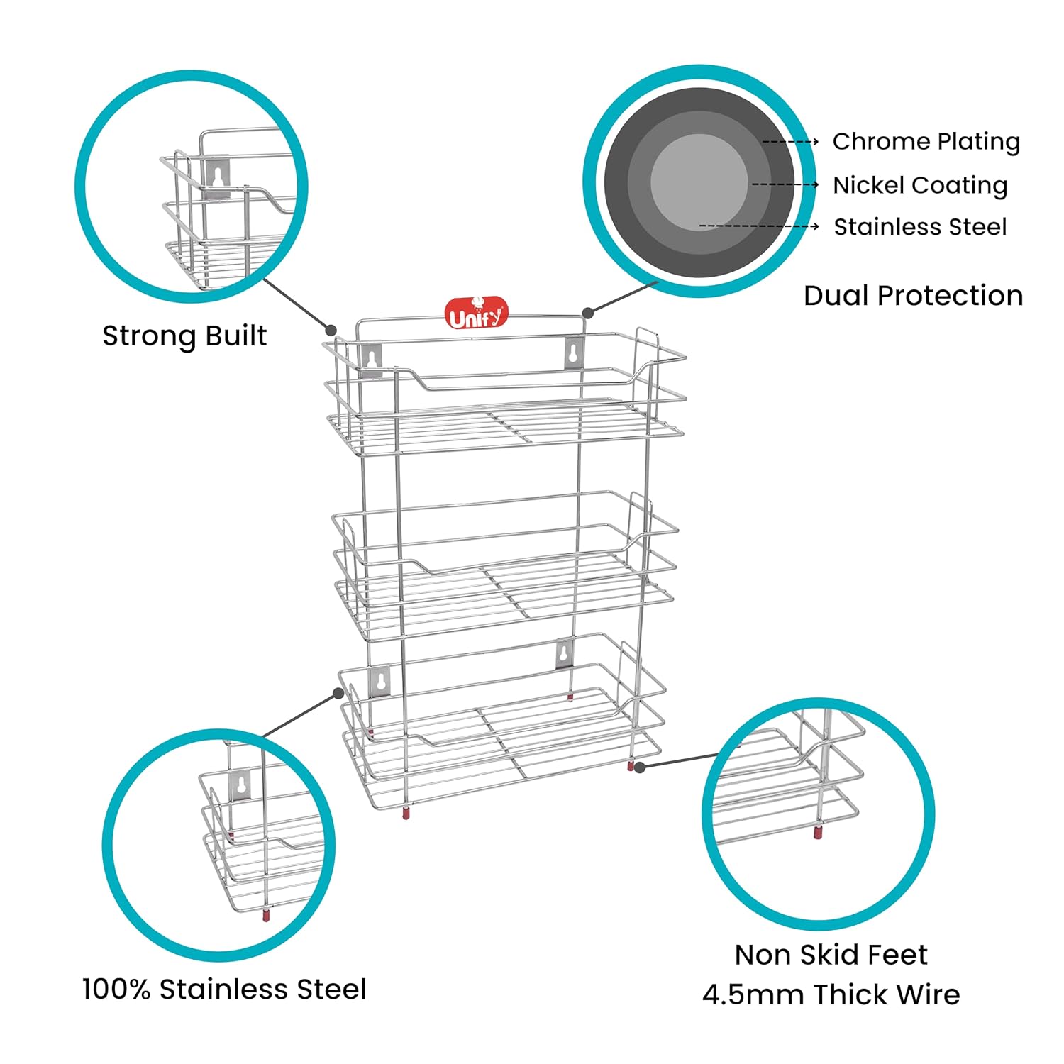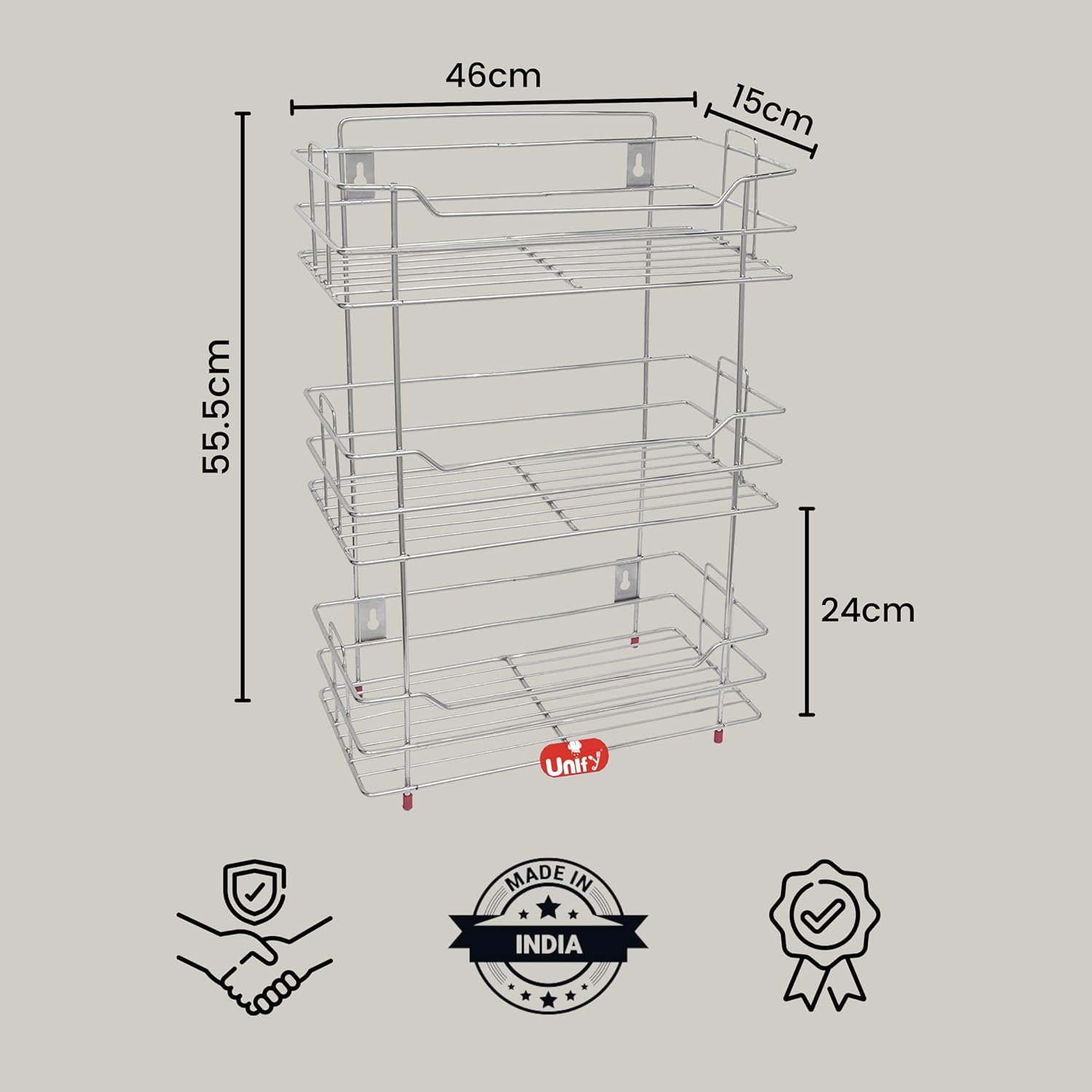 Organize your space with this 3-tier stainless steel rack, perfect for storing jars, bottles, and kitchen essentials. Its durable, rust-resistant design makes it ideal for both kitchen and bathroom use. Compact and sturdy, it offers ample storage with a sleek silver finish.