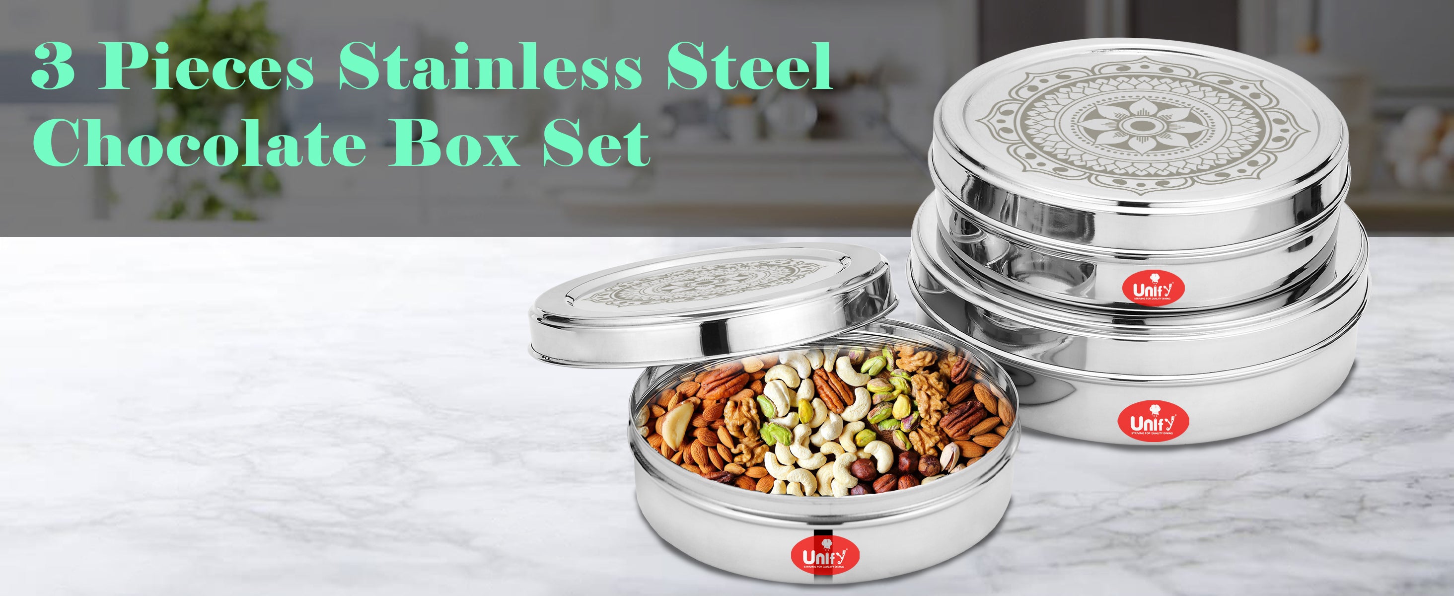 3 Pieces Stainless Steel Chocolate & Storage Box, 700ML/900ML/1200ML Airtight Canisters – Ideal for Dry Fruits, Snacks, Masala, Sweets, Gift Box for Kitchen