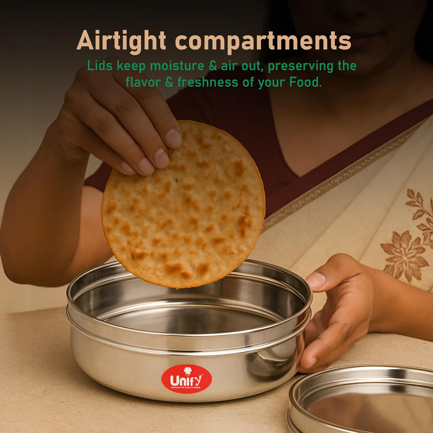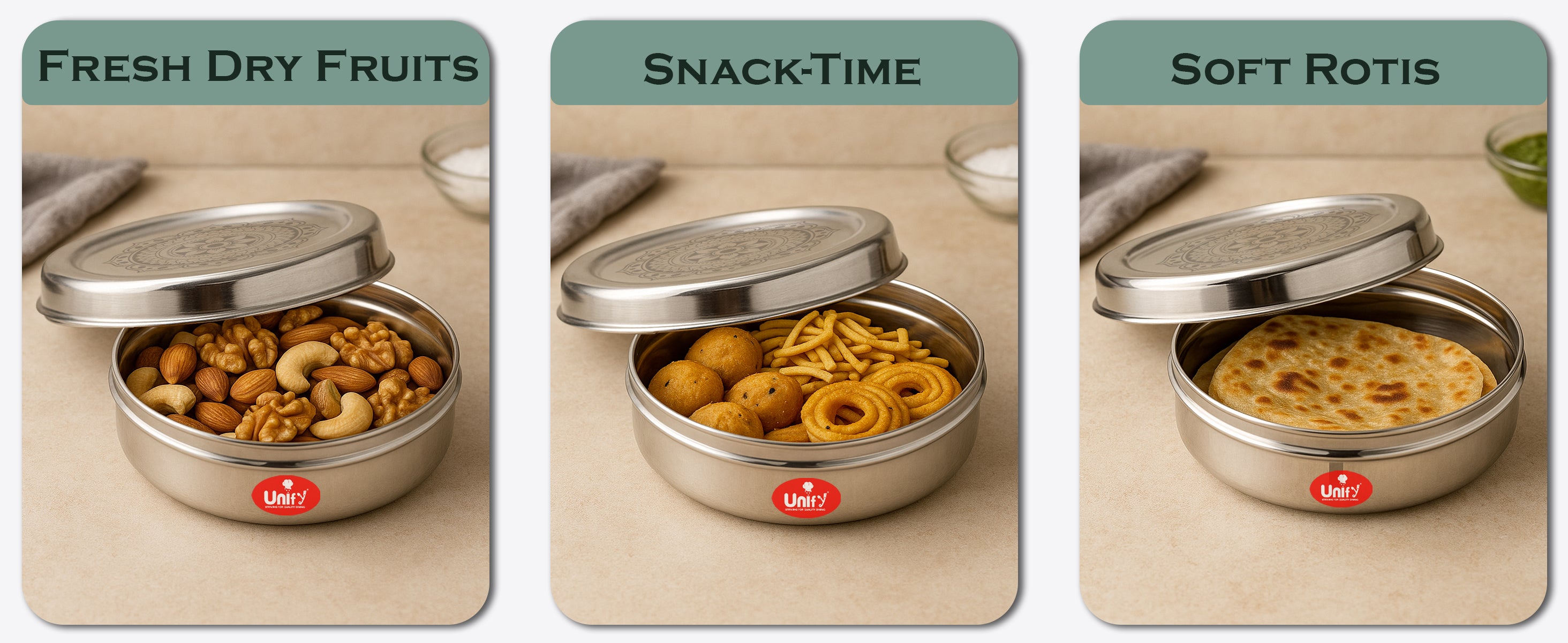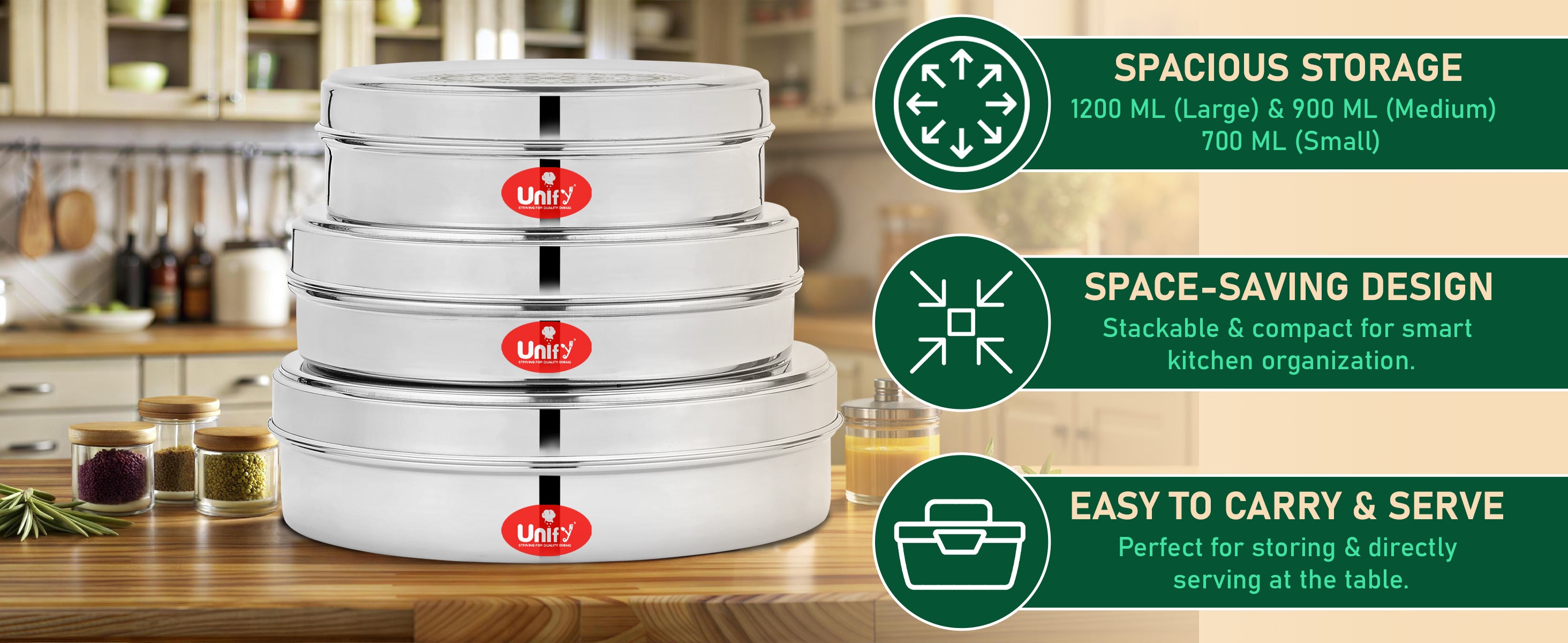 This set of 3 stainless steel airtight canisters offers versatile storage solutions with capacities of 700ML, 900ML, and 1200ML. Designed to keep dry fruits, snacks, masala, and sweets fresh, these durable containers prevent moisture and air exposure. The sleek design makes them ideal for organized kitchen storage or as a sophisticated gift box, combining functionality with aesthetic appeal for an expert-level kitchen setup.
