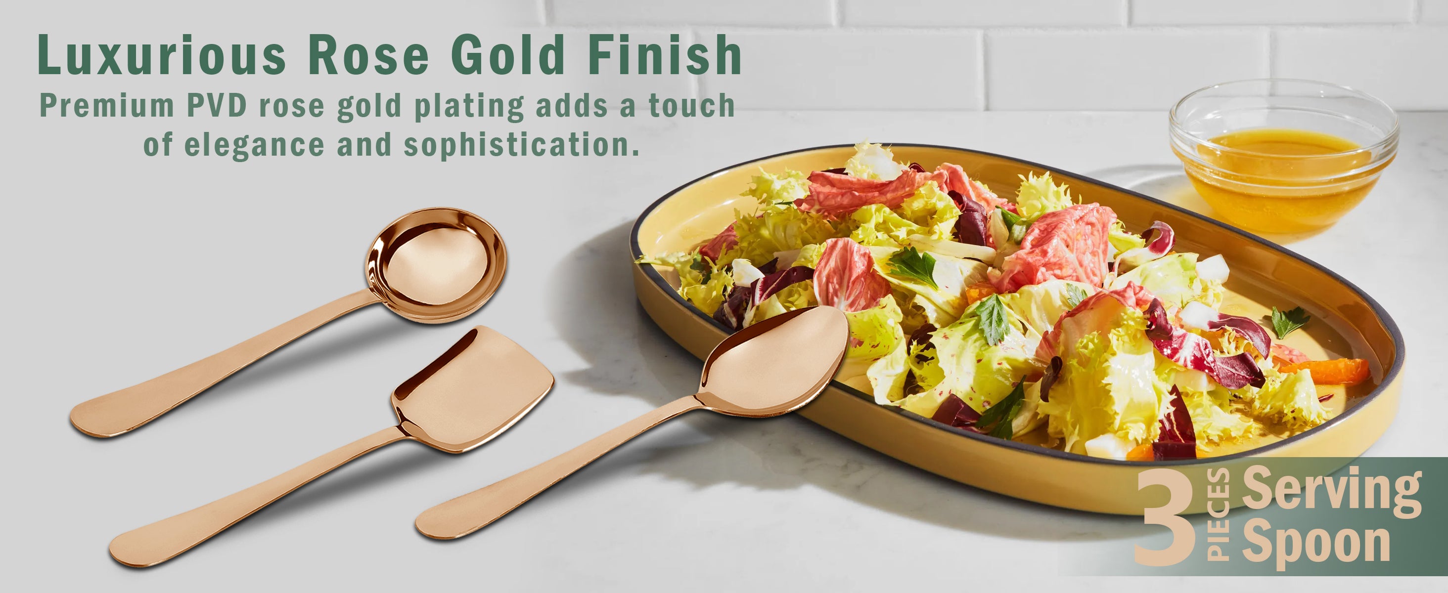 3-Piece Stainless Steel Rose Gold Serving Spoon Set | Heavy Gauge 1.8mm, 1 Soup, 1 Solid & 1 Rice Spoons