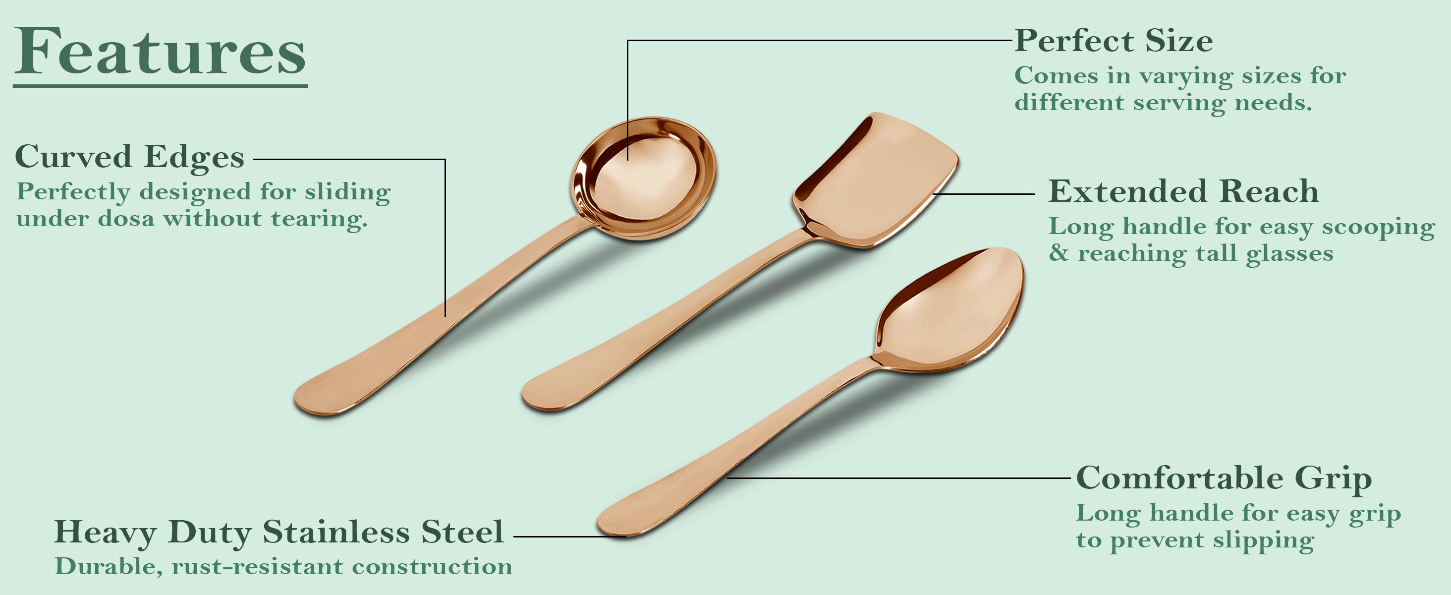 - PACKAGE INCLUDE :- We are offering 3 steel kitchen accessories items- 1 Ladle (Karchi), 1 Turner/Spatula (Palta), 1 Rice Spoon for all your cooking and serving needs.