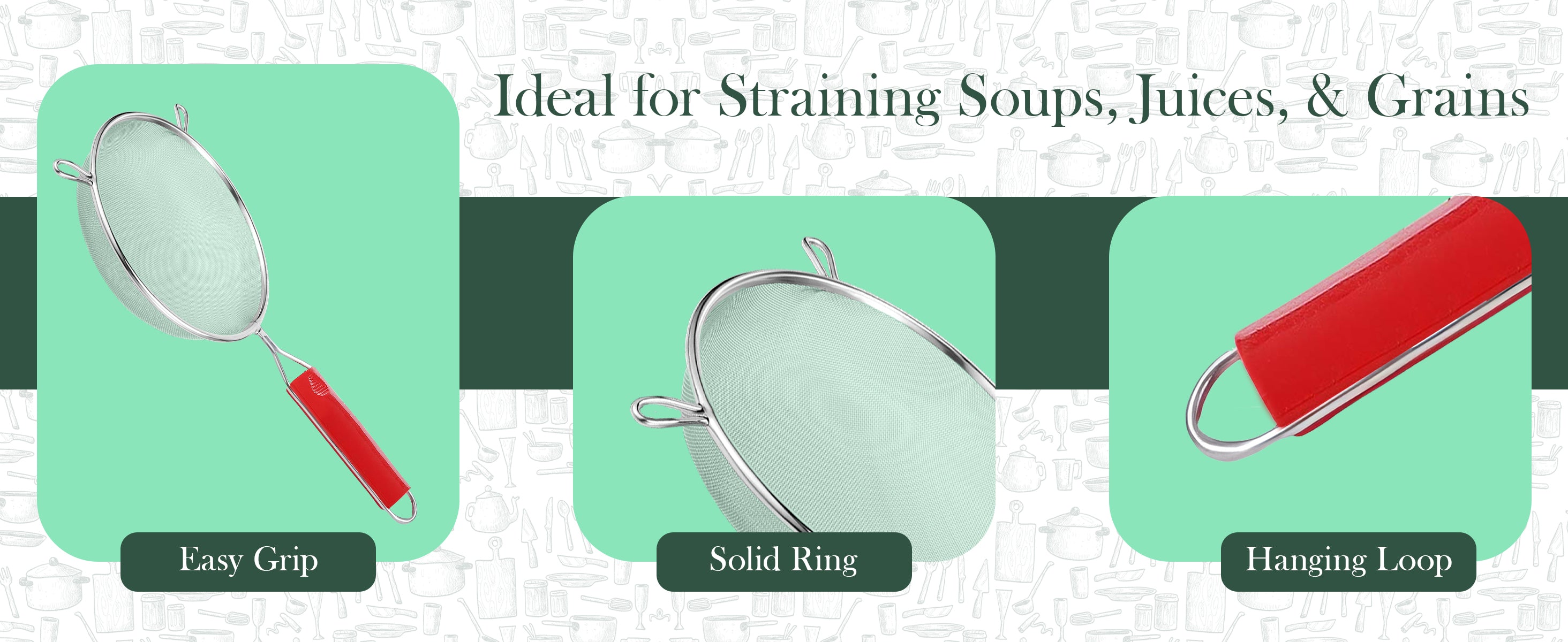 Stainless Steel Soup & Juice Strainer - Large Kitchen Liquid Filter with Red Handle