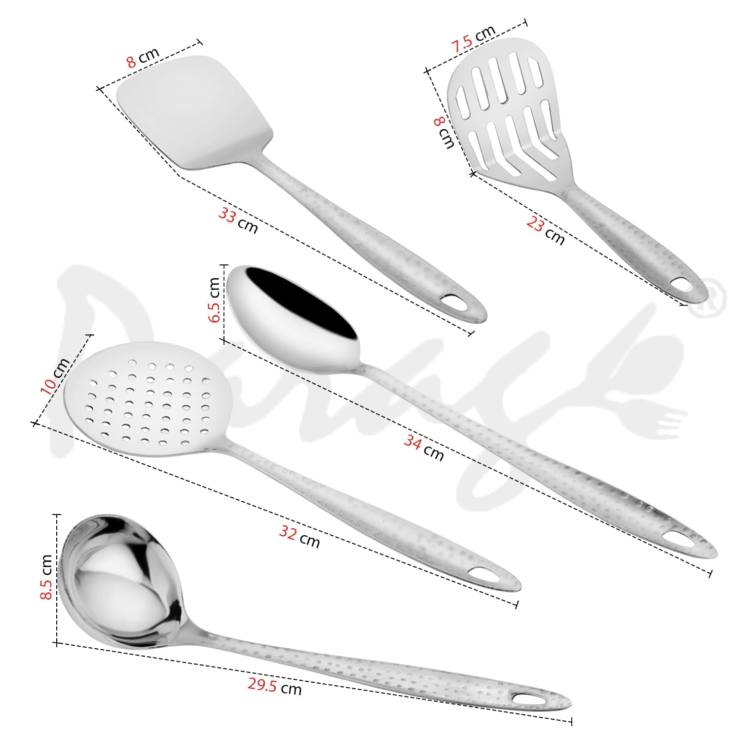 5 Pcs Stainless Steel Hammered Kitchen Tool Set for Cooking – 13” Spoons, Ladle, Skimmer, Turner, Spatula & Potato Masher, Silver