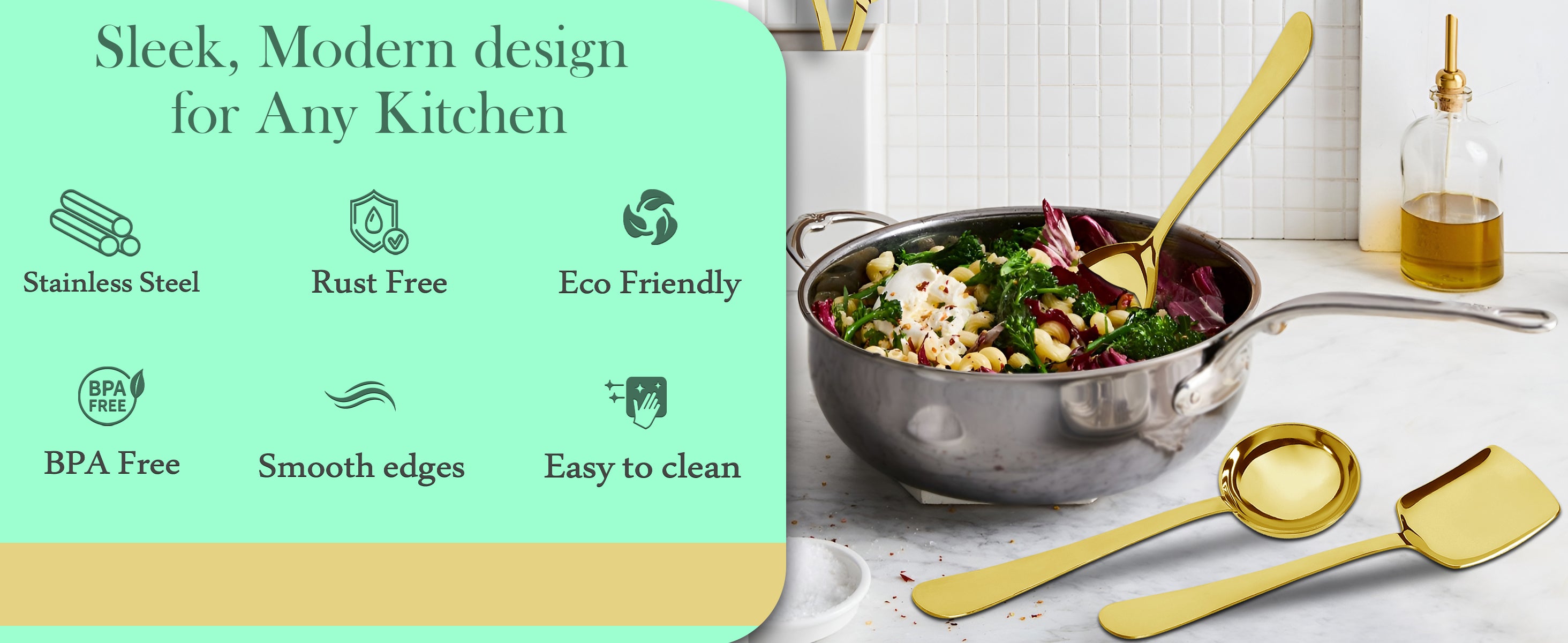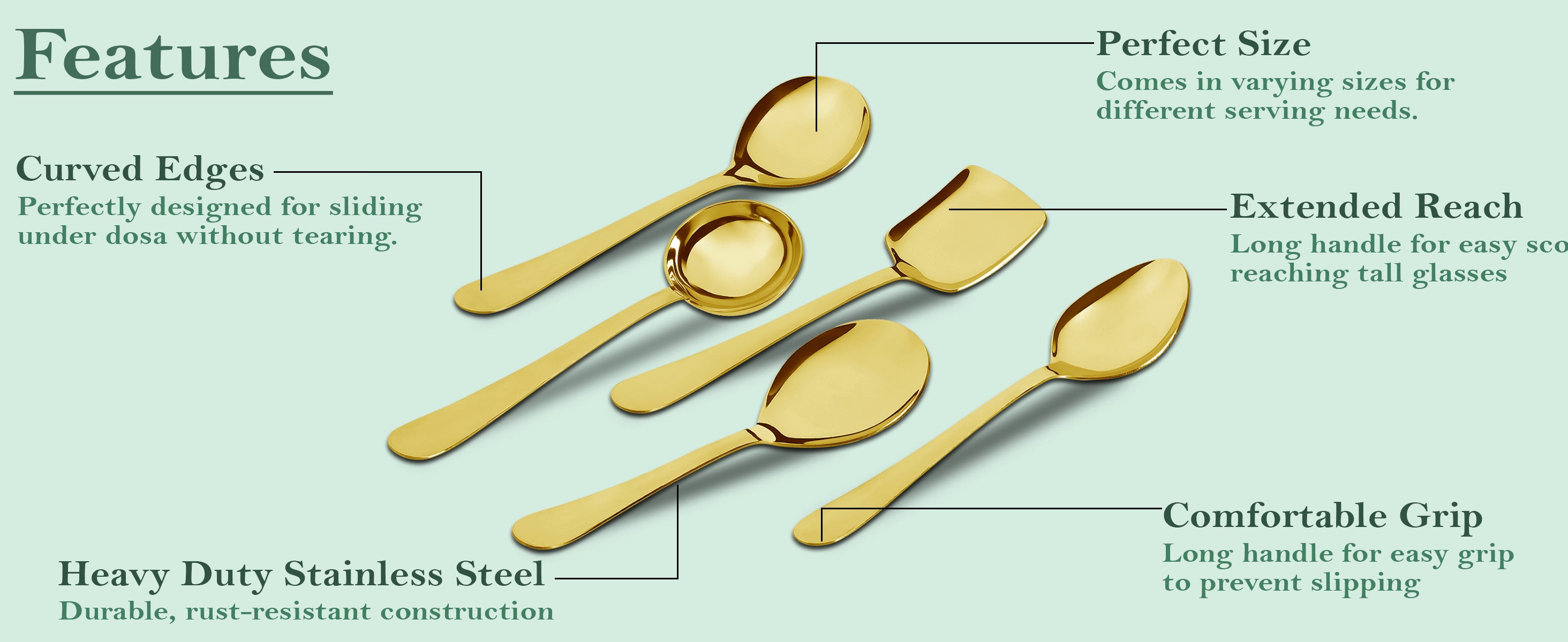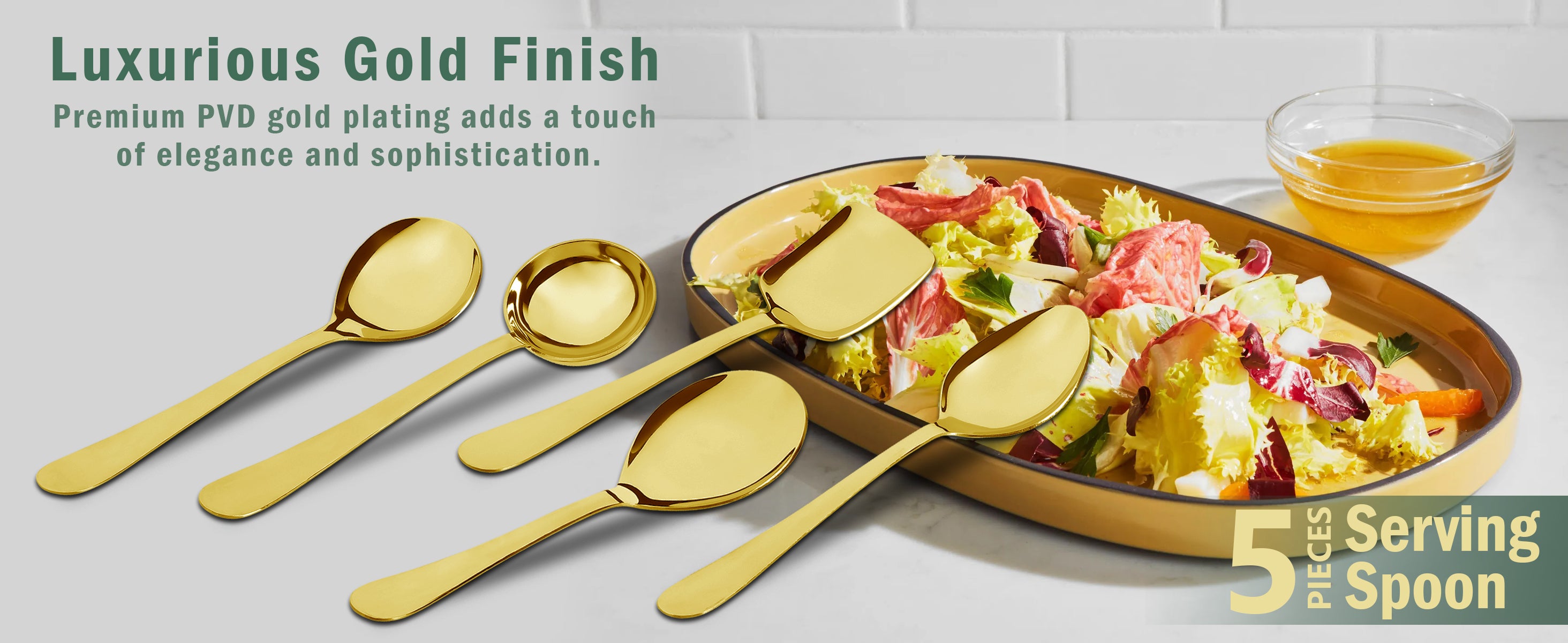 This 5-piece serving spoon set features heavy-gauge stainless steel construction with a gold finish, designed for durability and everyday kitchen use. Each spoon is crafted to withstand frequent handling and delivers reliable performance for serving a variety of dishes. The elegant gold tone adds a sophisticated touch to your dining experience while ensuring long-lasting strength and resistance to wear. Ideal for both professional and home kitchens, this set combines functionality with refined style.