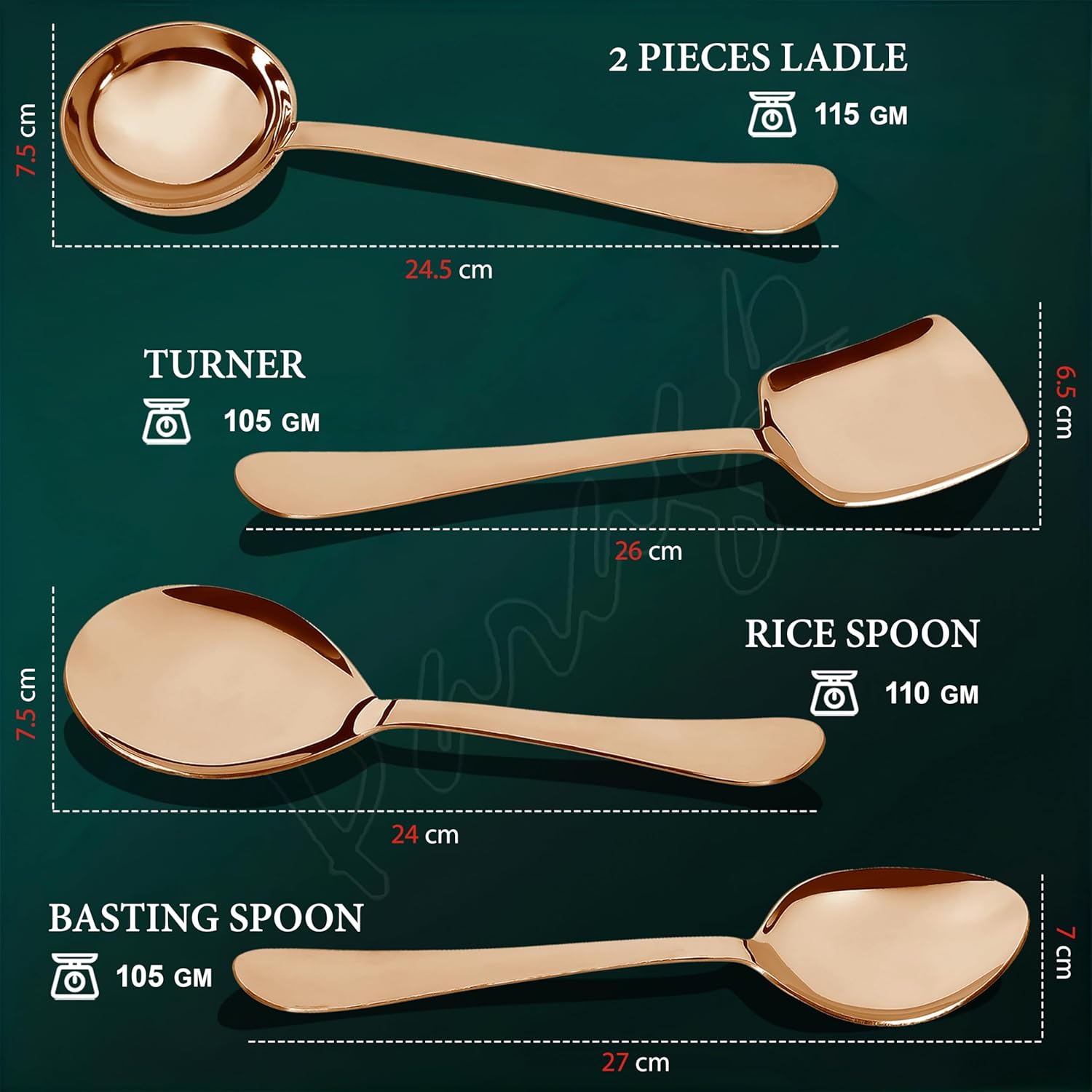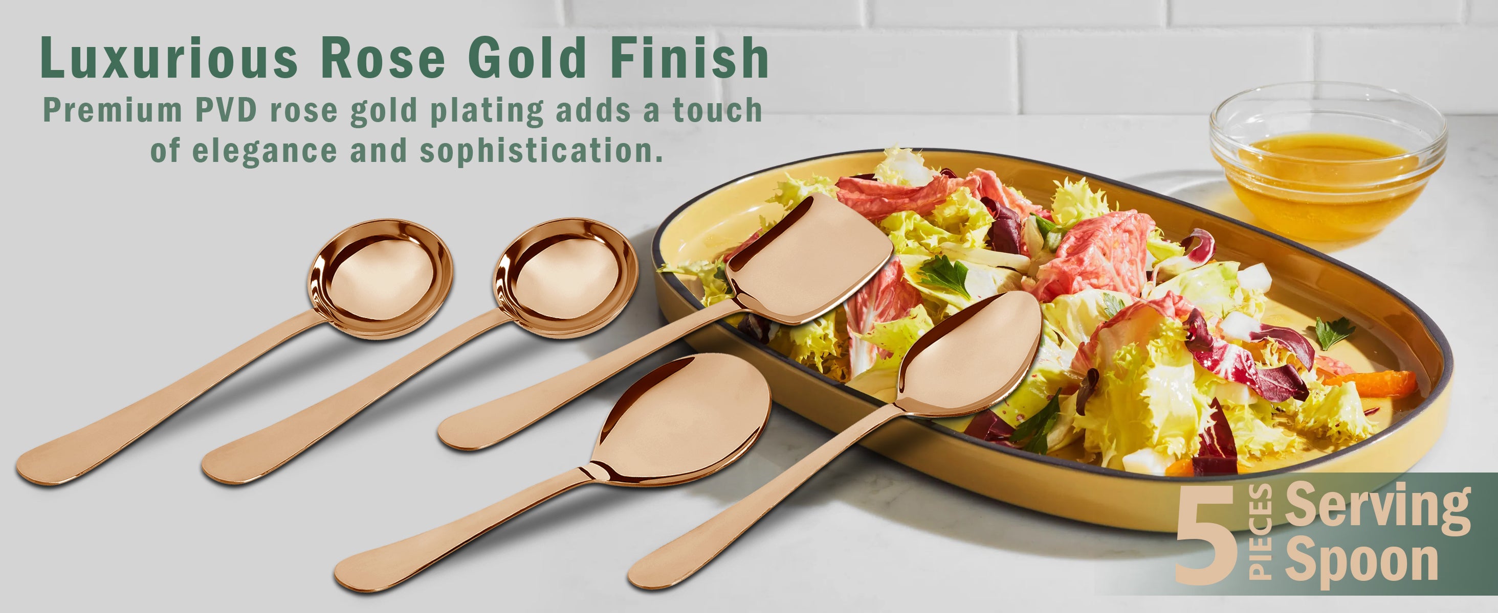 This 5-piece stainless steel serving spoon set is crafted from 1.8mm heavy gauge steel, ensuring durability and resistance to bending during use. The set includes a soup ladle, solid spoons, and rice spoons, all designed for versatile kitchen and dining applications. Its steel rose finish provides a sleek, modern look while maintaining strength and hygiene, making it ideal for both everyday meals and special occasions.
