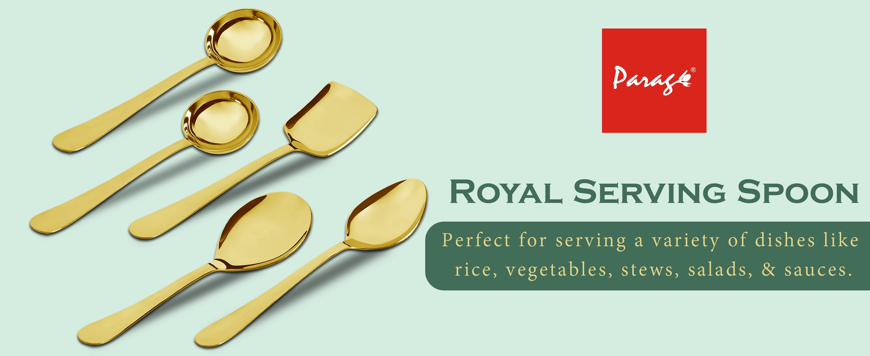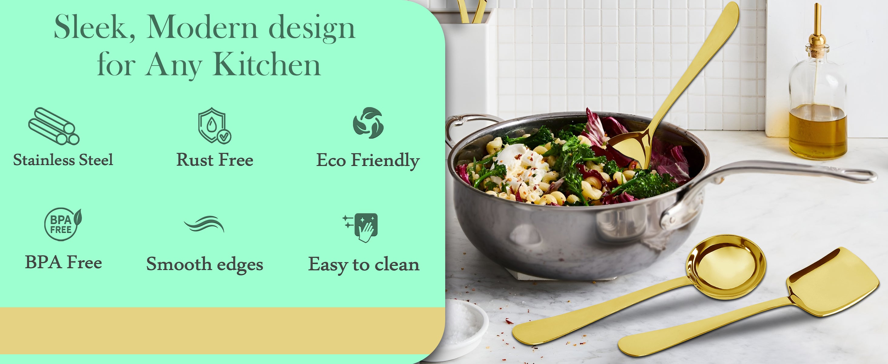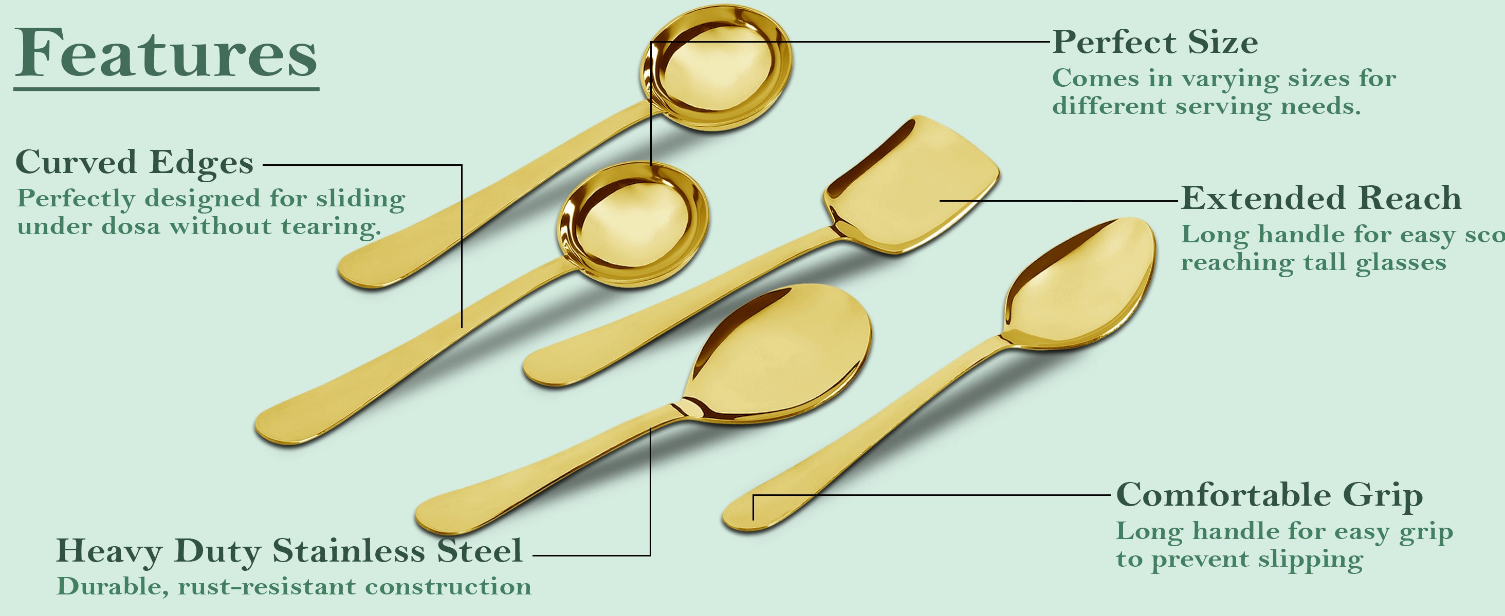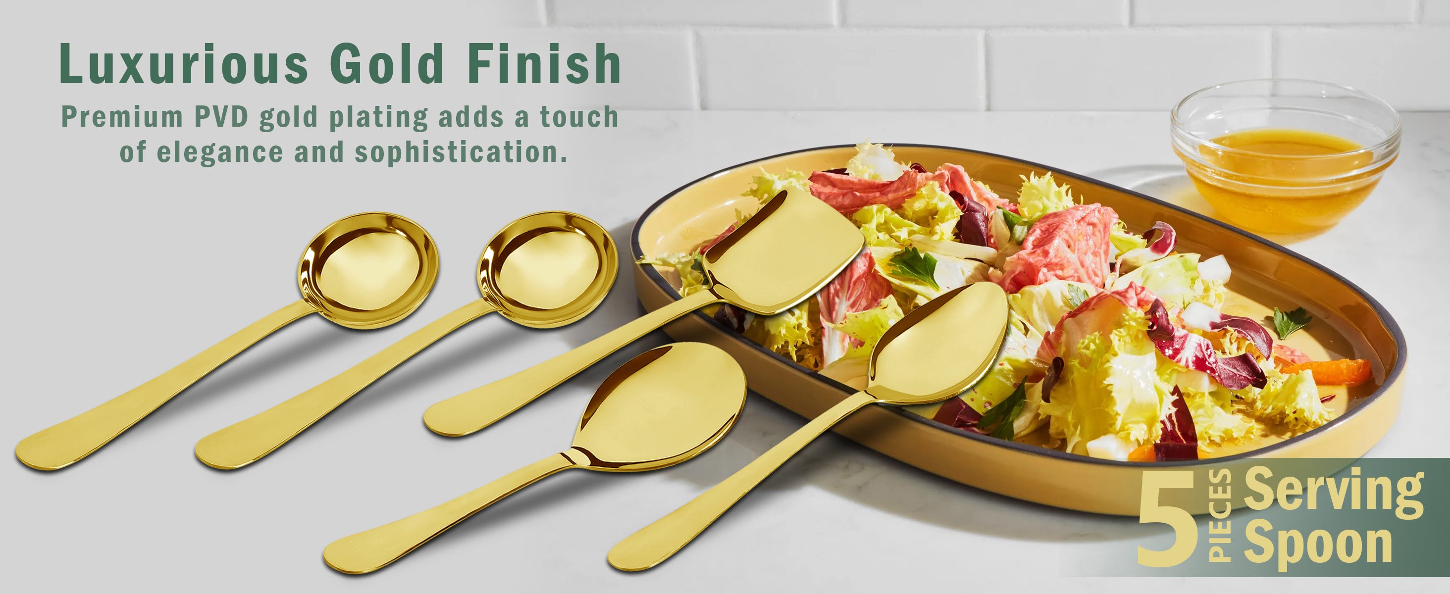 Enhance your kitchen and dining experience with this 5-piece stainless steel serving spoon set in elegant gold finish. Crafted from 1.8mm heavy gauge stainless steel, each spoon offers durability and a solid feel for everyday use. The set includes a soup ladle, a solid spoon, and a rice spoon, covering a range of serving needs. Designed for both functionality and style, these spoons resist corrosion and maintain their shine, ensuring reliable performance and a touch of sophistication at your table.