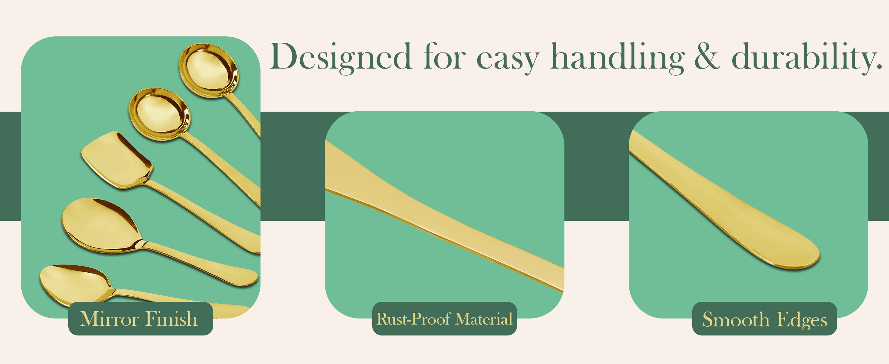 5 Pcs Stainless Steel Gold Serving Spoon Set for Kitchen & Dining – 1.8mm Heavy Gauge, Soup Ladle, Solid & Rice Spoon (Pack of 5)