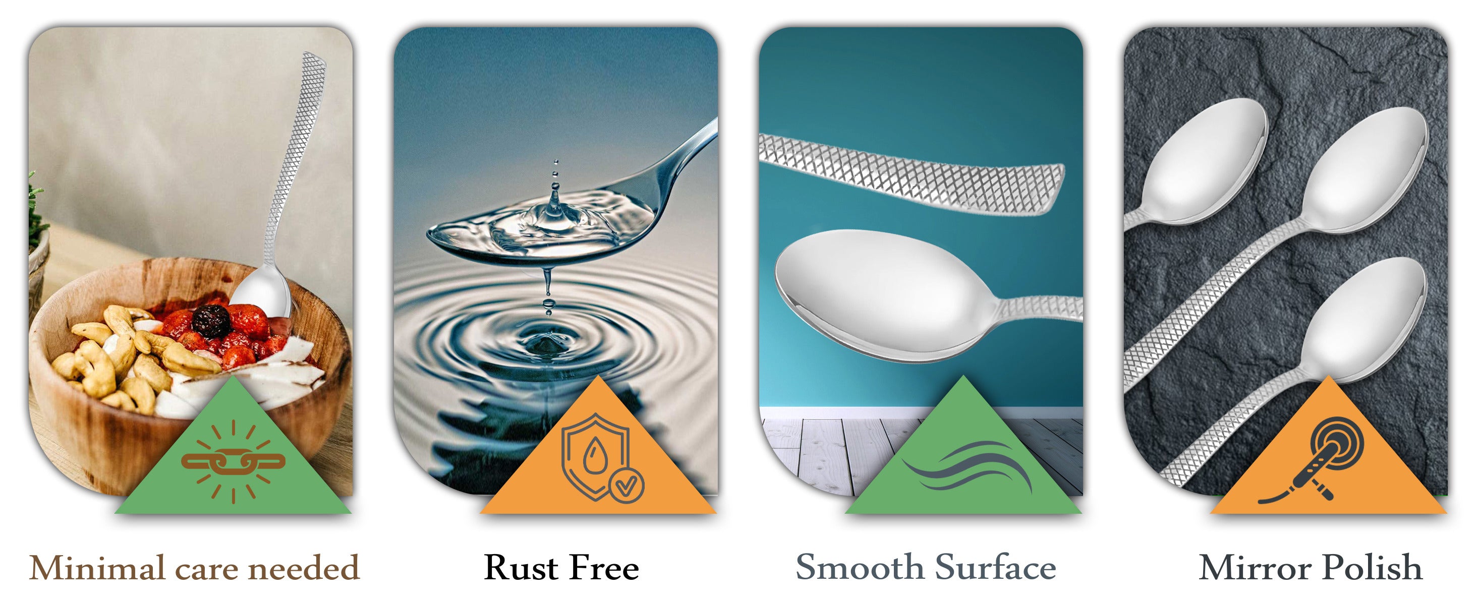 - MIRROR FINISH-: The spoons feature a polished mirror finish, giving them a sleek and lustrous appearance. This not only adds to their visual appeal but also makes them easy to clean and maintain.