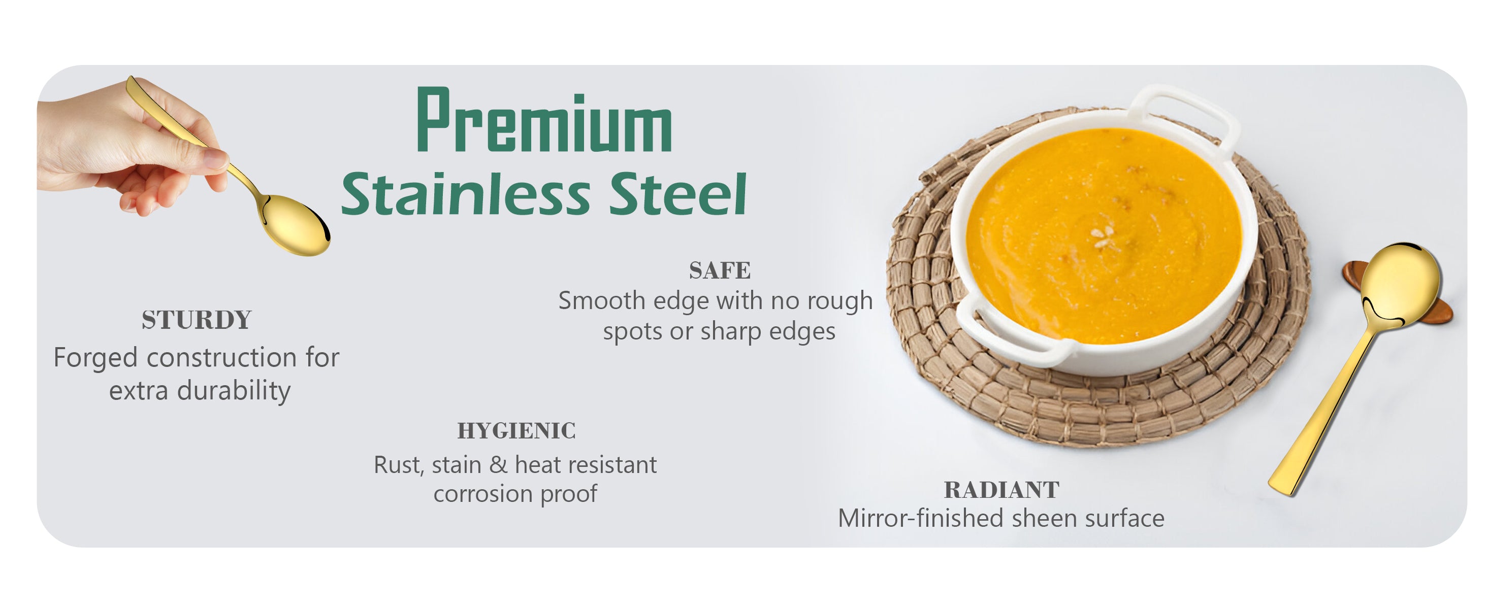 - HIGH-QUALITY FOOD-GRADE STAINLESS STEEL: Crafted from premium food-grade stainless steel, these soup spoons ensure safe and hygienic dining. They are highly resistant to rust, corrosion, and stains, maintaining their elegant look even after prolonged use.