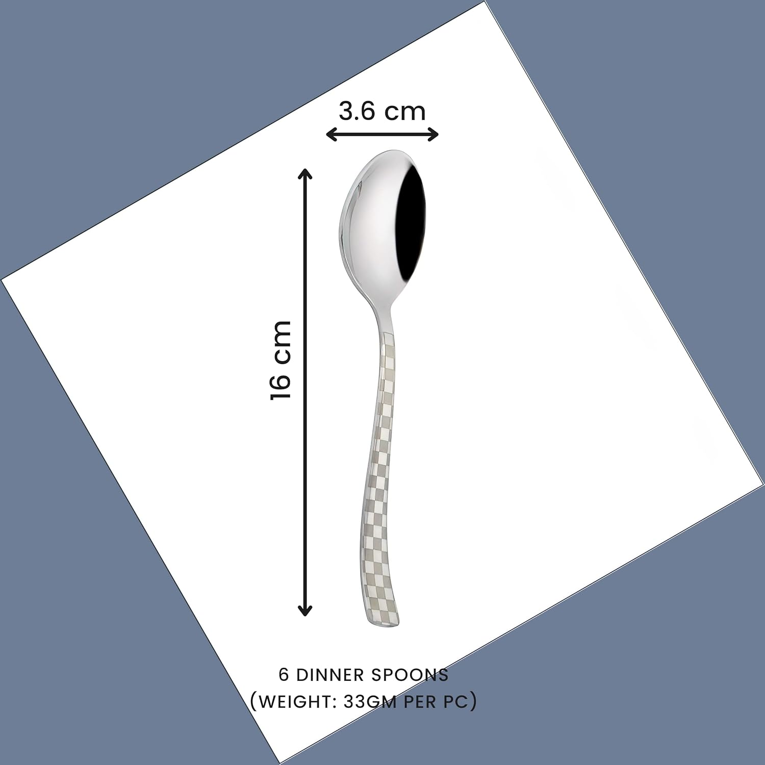 6 Pieces Stainless Steel Premium Dinner Spoon Set, 16 cm, Silver, Checks Design