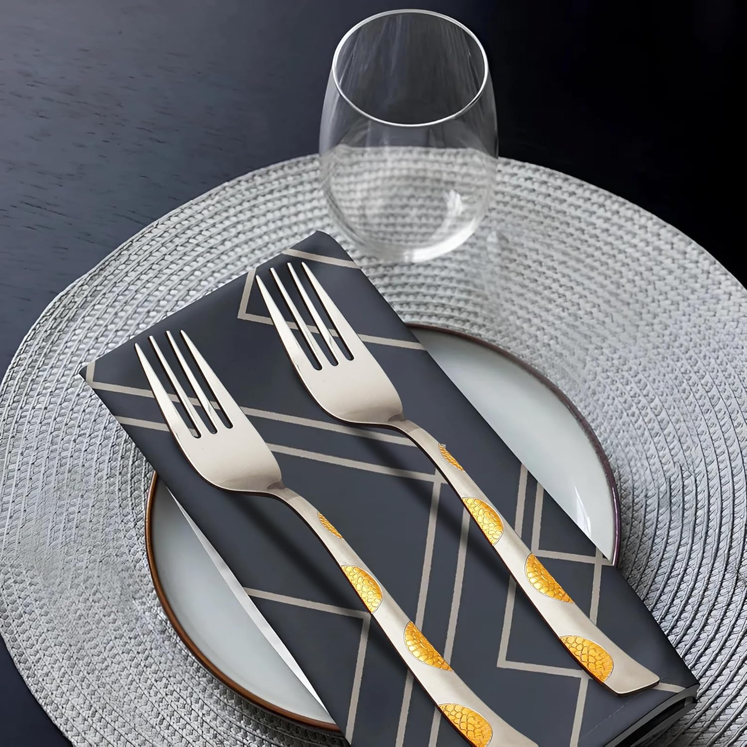 Elevate your dining experience with this set of 6 stainless steel forks, beautifully finished in 24K gold for a luxurious touch. Featuring a unique Moonpress design, each fork combines durability with elegant craftsmanship. Perfect for both everyday use and special occasions, this premium cutlery set makes an exceptional gift for home or kitchen enthusiasts seeking style and quality.