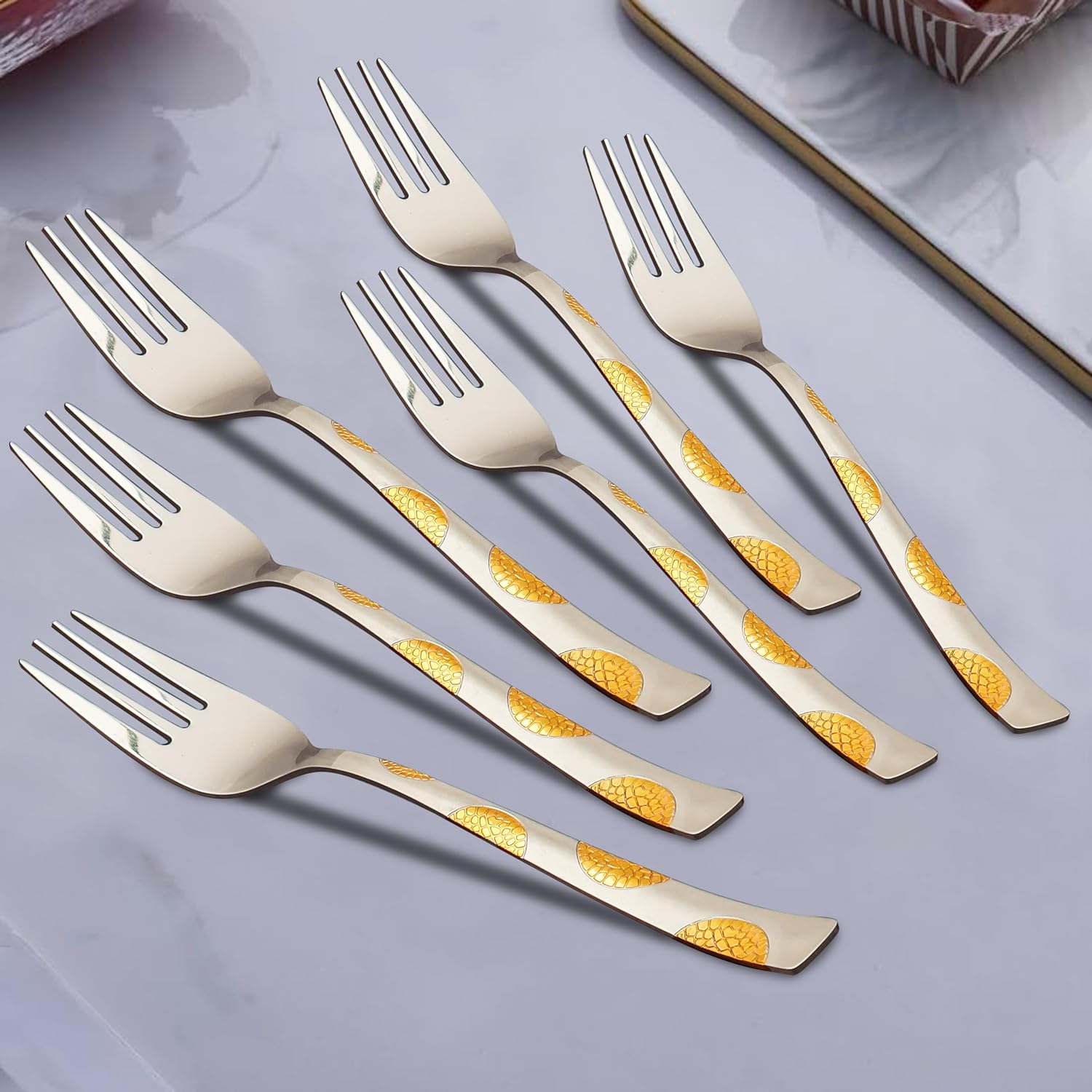 6 Pieces Stainless Steel 24K Golden Forks Set, Premium Luxury Dining Cutlery with Moonpress Design – Ideal Gift for Home & Kitchen