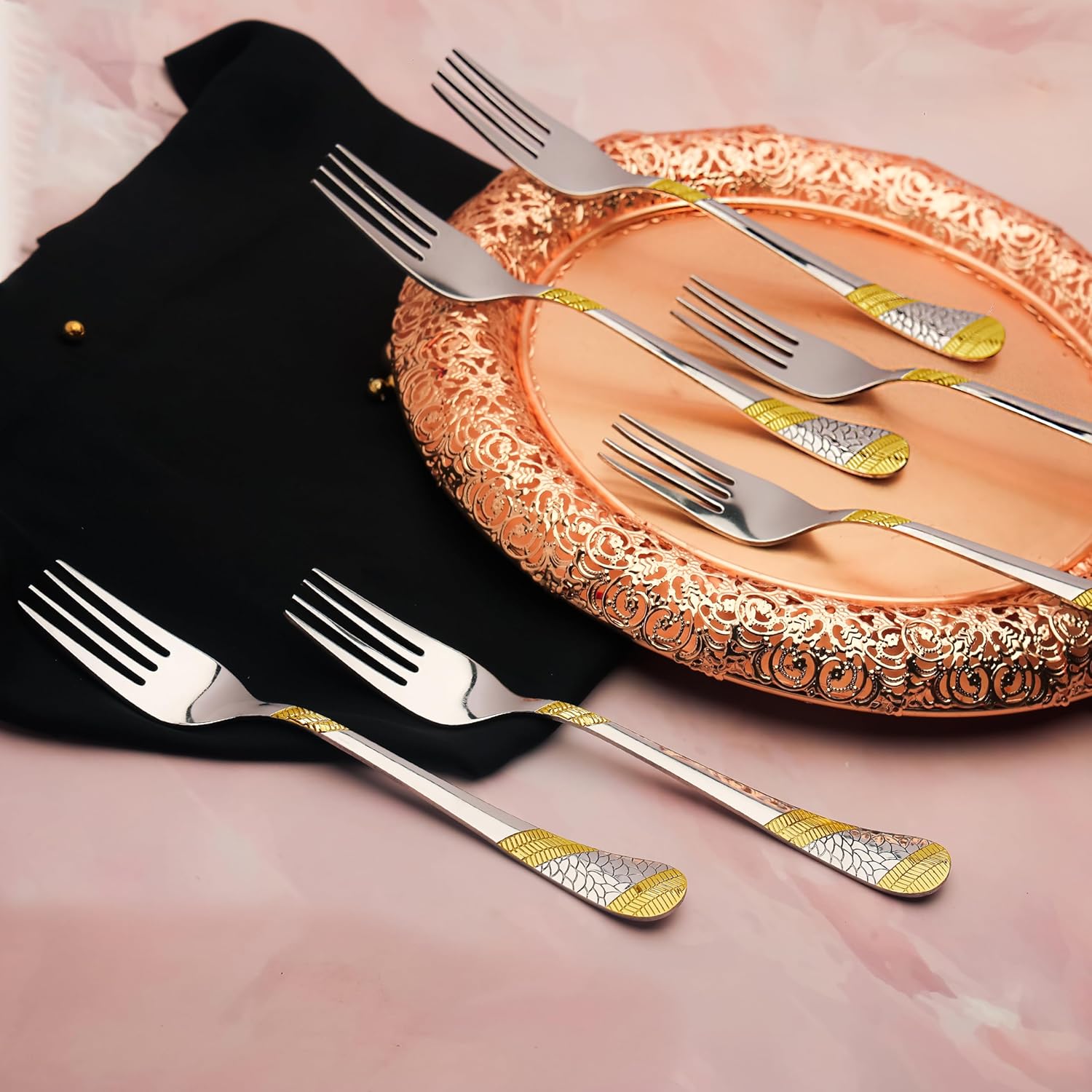 Elevate your dining experience with this set of six 18.5 cm table forks crafted from durable stainless steel and finished with luxurious 24K gold plating. Designed for premium quality and lasting shine, these forks combine elegance with practicality, making them ideal for formal dinners and special occasions. Their balanced weight and smooth finish ensure comfortable handling while enhancing your table setting with a sophisticated touch.