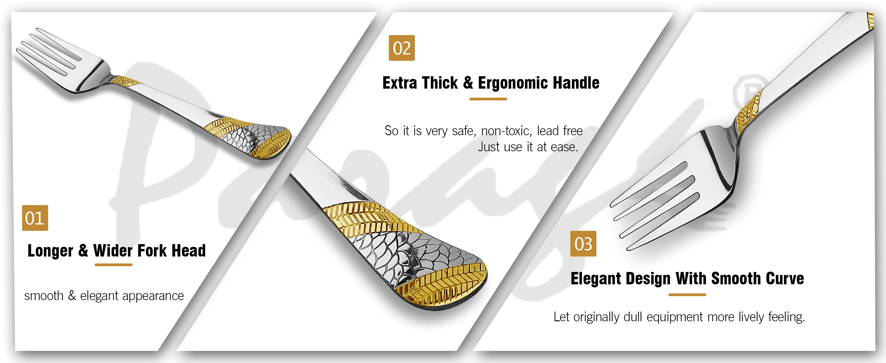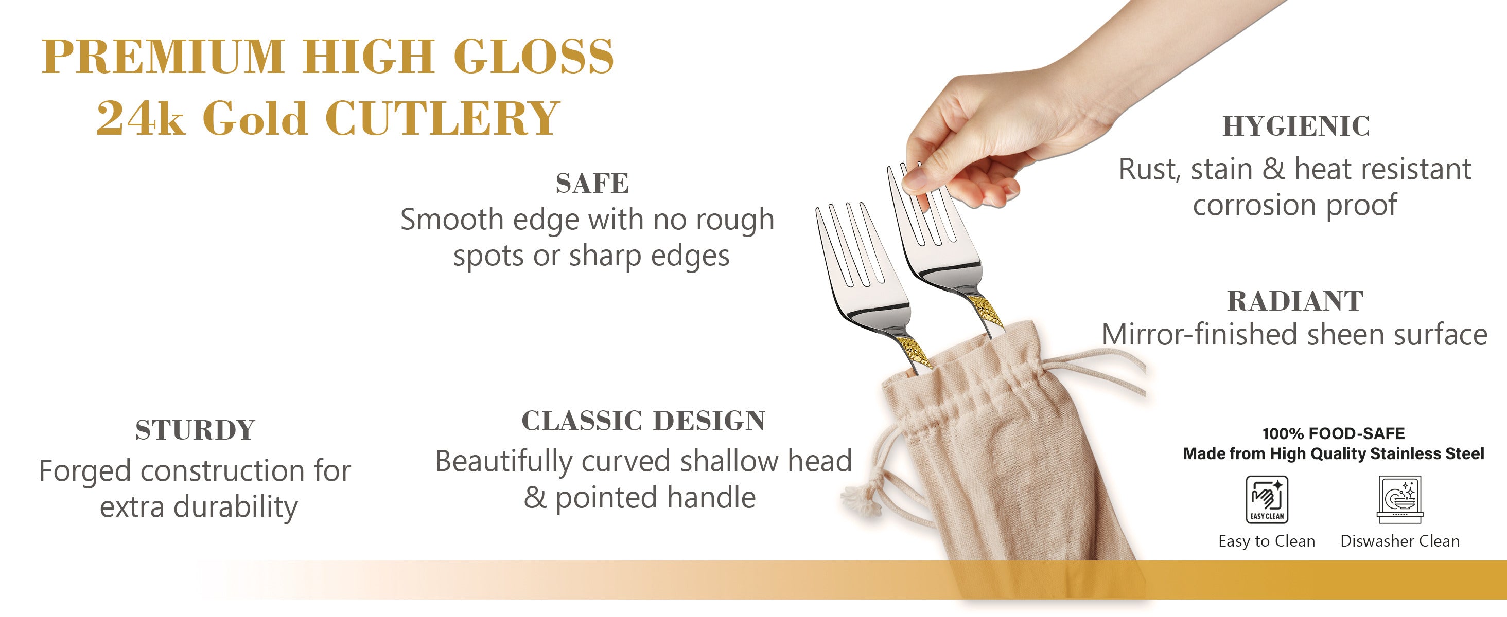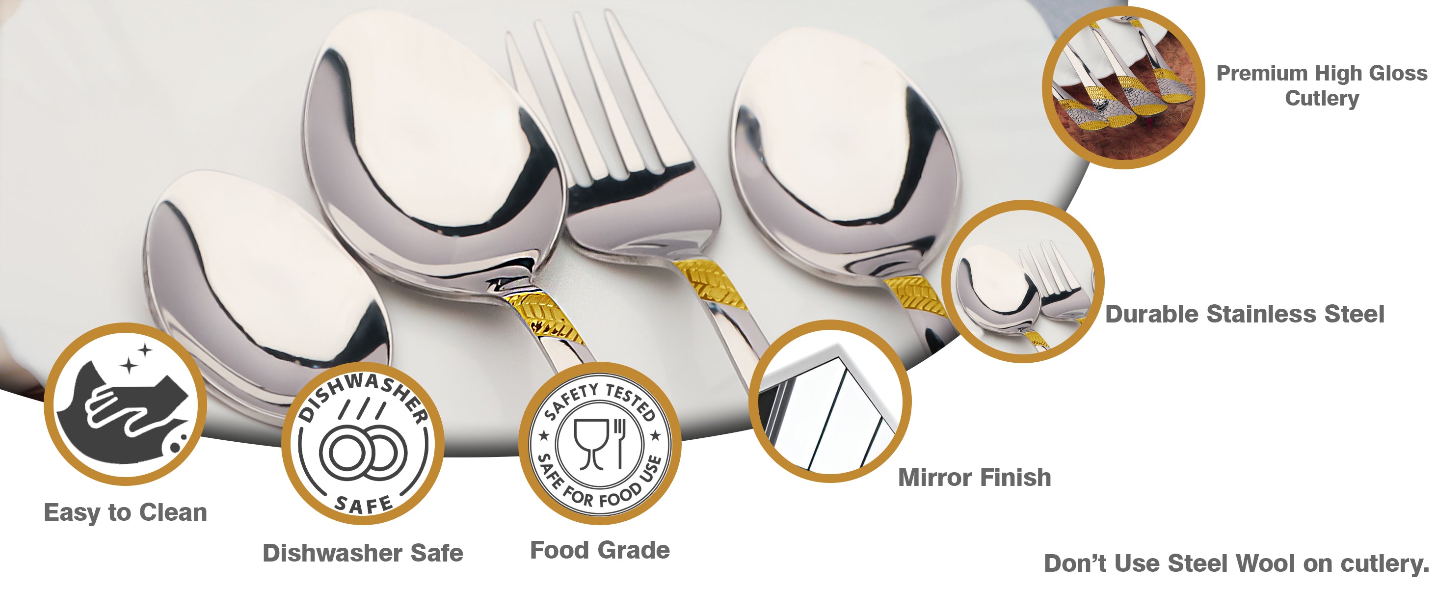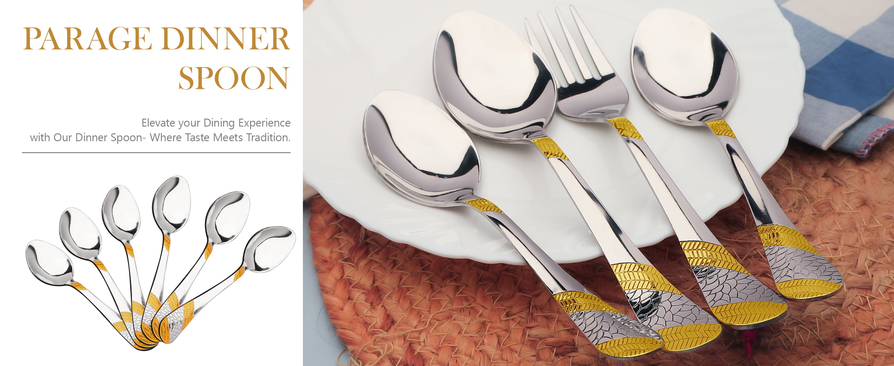 - PREMIUM STAINLESS STEEL WITH 24K GOLD FINISH: Crafted from high-quality stainless steel, these Dinner spoons are plated with genuine 24k gold, ensuring durability, corrosion resistance, and a stunning golden finish. It gives dual tone feel because of the combination of 24k carat gold and matt finish used on the cutlery handle.