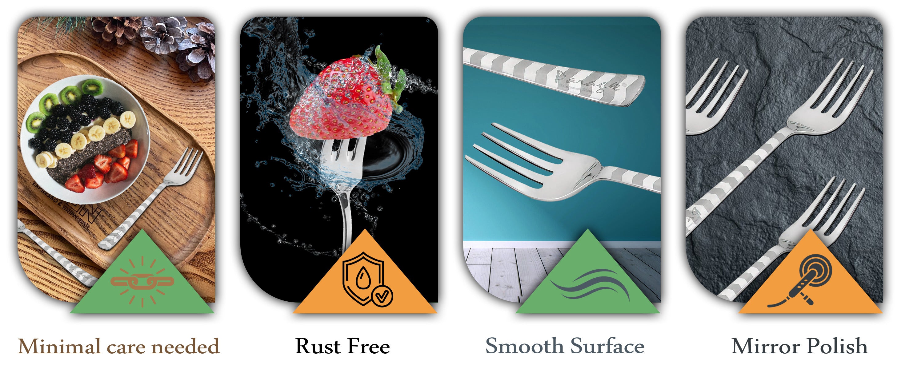This set of six stainless steel baby forks, each measuring 16 cm, features a durable and shiny handle with a subtle checks design for an elegant yet practical appeal. Crafted for everyday use, these forks combine sturdy construction with child-friendly size, making them ideal for family meals. Their robust build ensures long-lasting performance in any kitchen, while the sleek finish adds a touch of sophistication to your dining table. Perfect for safe, comfortable feeding and easy cleaning, this cutlery set supports both functionality and style in your home.