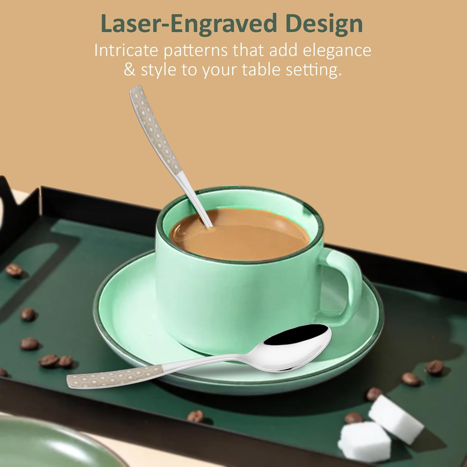 6 Pieces Stainless Steel Premium Tea Spoon Set for Home & Kitchen – 14 cm Luxury Dining Tableware, Laser Chammach Set, Silver with Dazzle Design