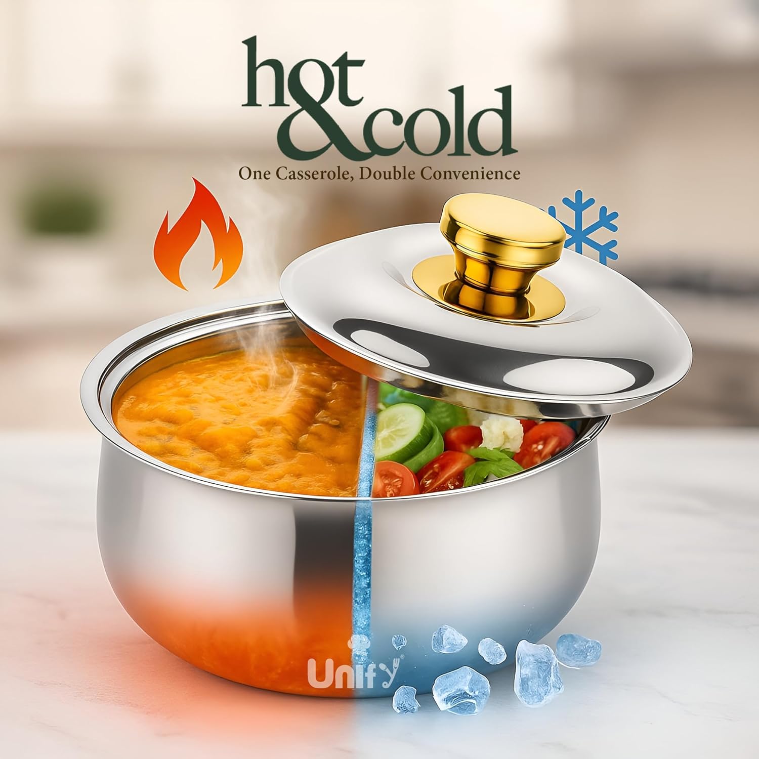 Elevate your dining experience with this Metra Stainless Steel Insulated Casserole (3000ml). Featuring a PVD gold-plated handle and premium mirror finish, it brings both elegance and performance to your kitchen. The double-wall insulation keeps food hot and fresh for hours, making it perfect for serving rotis, chapatis, rice, and curries. Crafted from food-grade, BPA-free stainless steel, this casserole is durable, rust-resistant, and easy to clean — ideal for everyday use or as a thoughtful kitchen and dining gift.