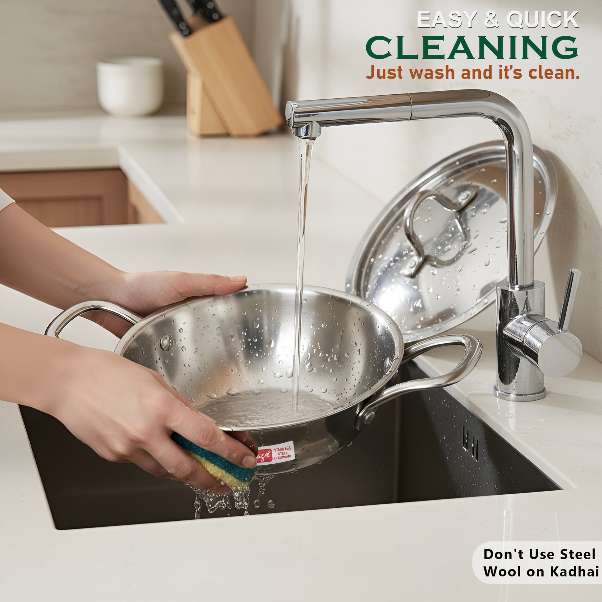 Stainless Steel Triply Kadai with Lid – Tough, Stylish & Practical Our stainless steel triply kadai with lid resists rust, stains, and dents. Works perfectly as a wok or deep frying kadhai. A top pick for any stainless steel cookware set.