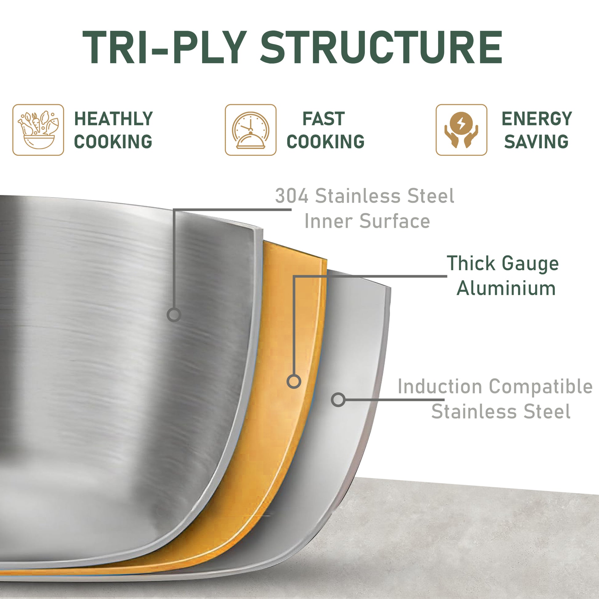 PRESERVATION OF NUTRIENTS AND 100% FOOD SAFE: The even heat distribution preserves 85% of nutrients, ensuring healthier dishes. The kadhai is 100% food safe, 304 Stainless steel, safest of all for cooking, with no harmful chemical coatings. Food-grade 18/8 stainless steel for rust-free, hygienic cooking. 100% PTFE and PFOA free.