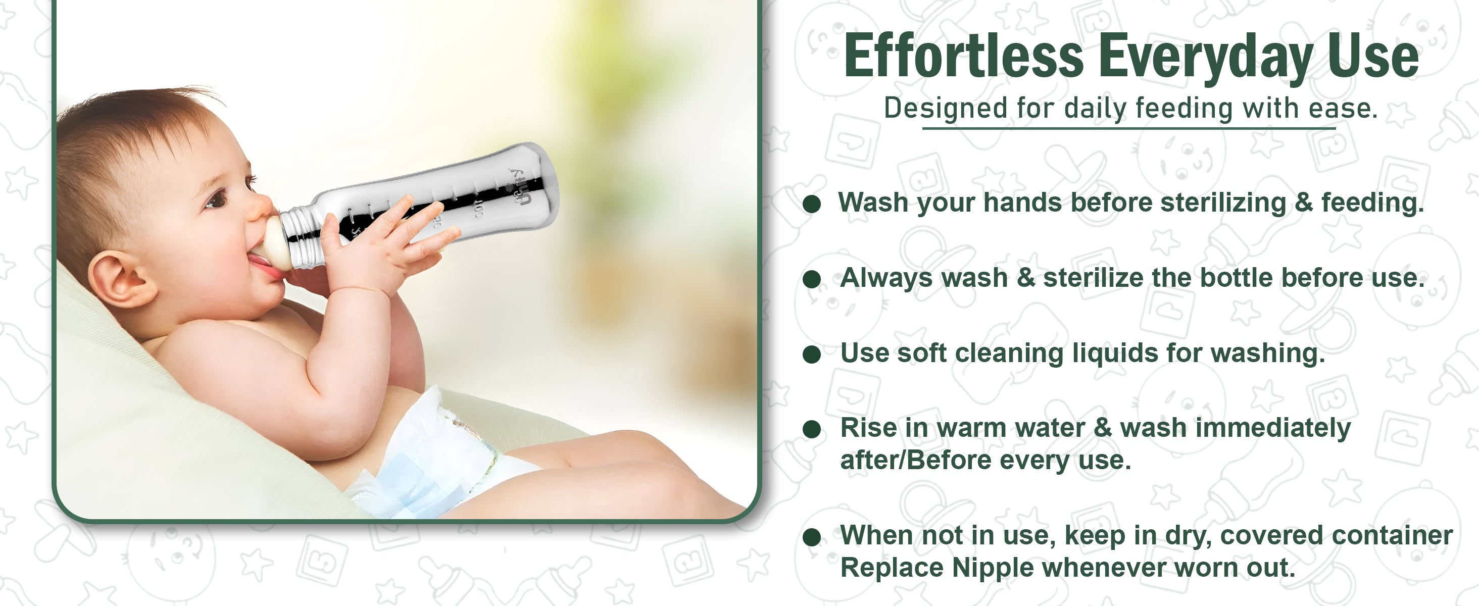 This 250ml stainless steel baby feeding bottle offers a safe and durable alternative to plastic. Made from high-quality, BPA-free stainless steel, it ensures your baby's feed remains free from harmful chemicals. Its sturdy construction resists dents and scratches, making it ideal for everyday use. The bottle’s lightweight design and secure nipple promote easy feeding and comfortable handling, providing peace of mind for parents focused on health and safety.
