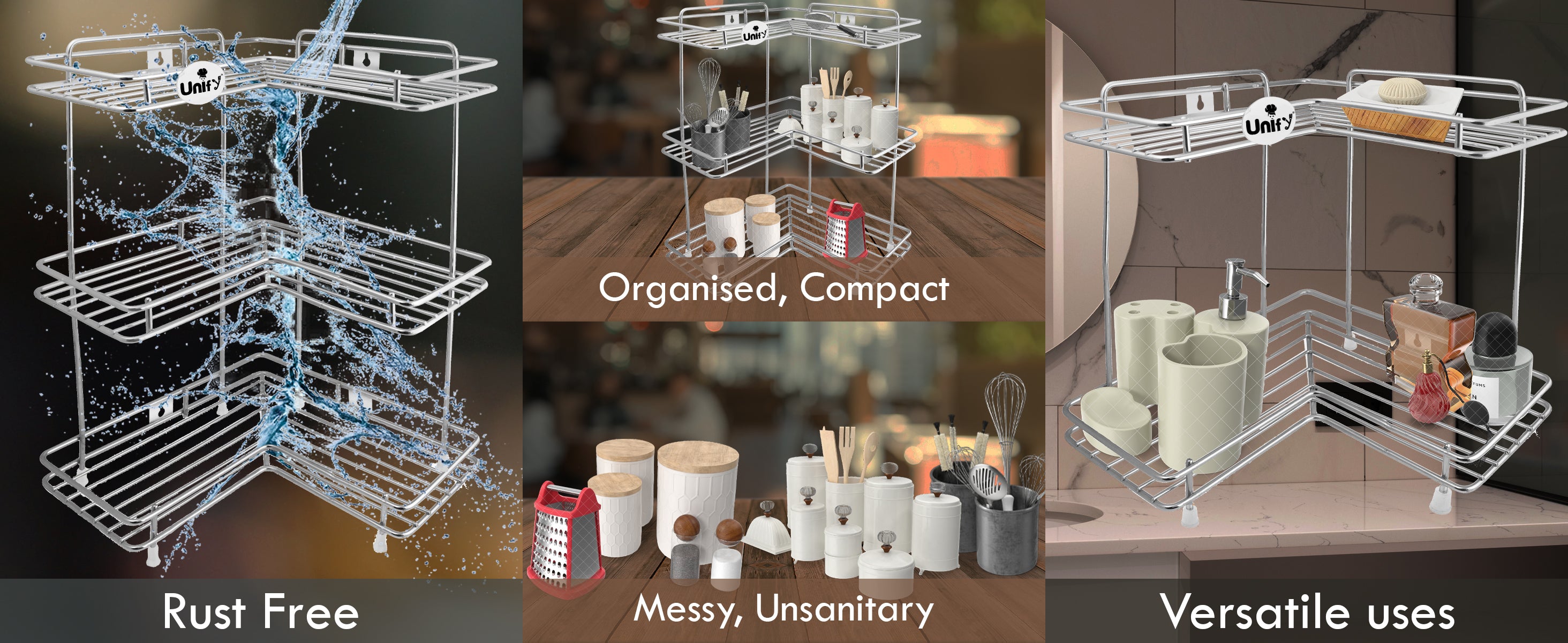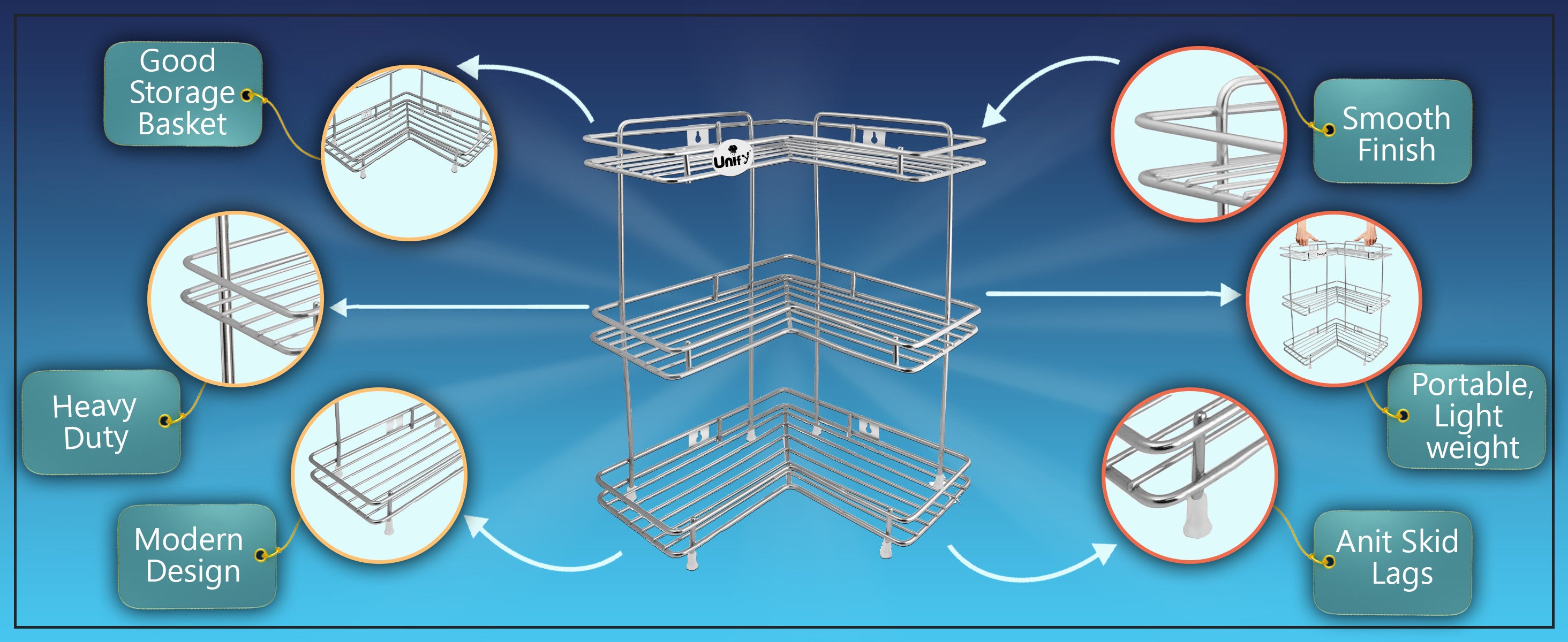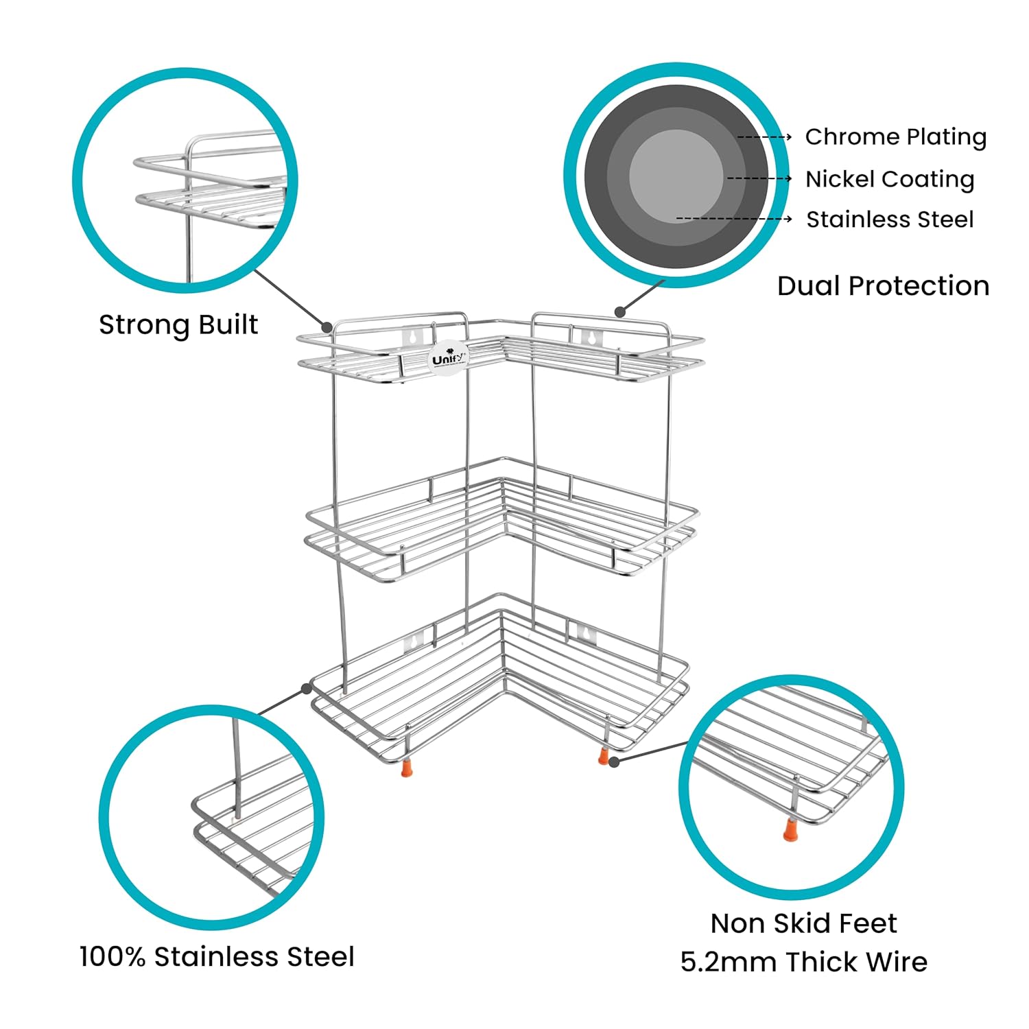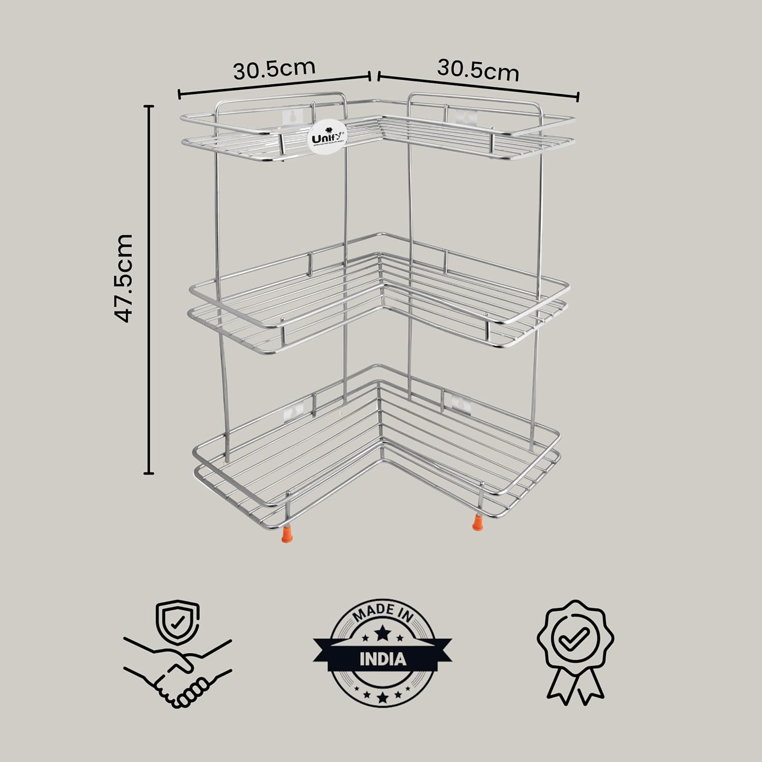 3-Tier Stainless Steel L-Corner Shelf Rack – Multipurpose Organizer for Kitchen & Bathroom, 31×31×46 cm, Chrome Finish, Silver