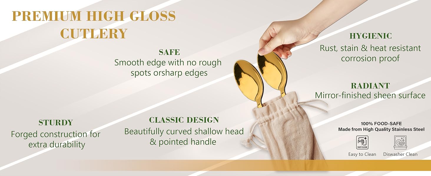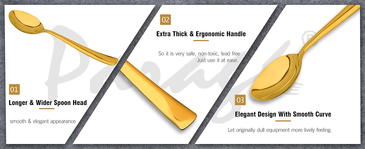 - Timeless Appeal: The PVD gold plating gives these spoons a timeless appeal, ensuring that they remain a cherished part of your dining experience for years to come. The classic design and quality materials contribute to the set's enduring beauty. Indulge in the epitome of luxury and sophistication with the Parage Elegance Spoon Set, a perfect blend of craftsmanship, quality, and timeless design.
